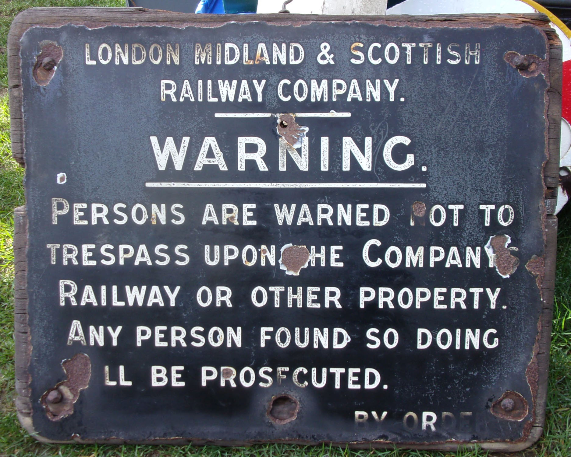 London Midland & Scottish Railway Company Warning Sign ref to Trespass, still affixed to its original wooden board, not in the best condition but totally original. Located at Entwistle Station Road Bridge. 23″ x 20″ OD. 2 x images to view.