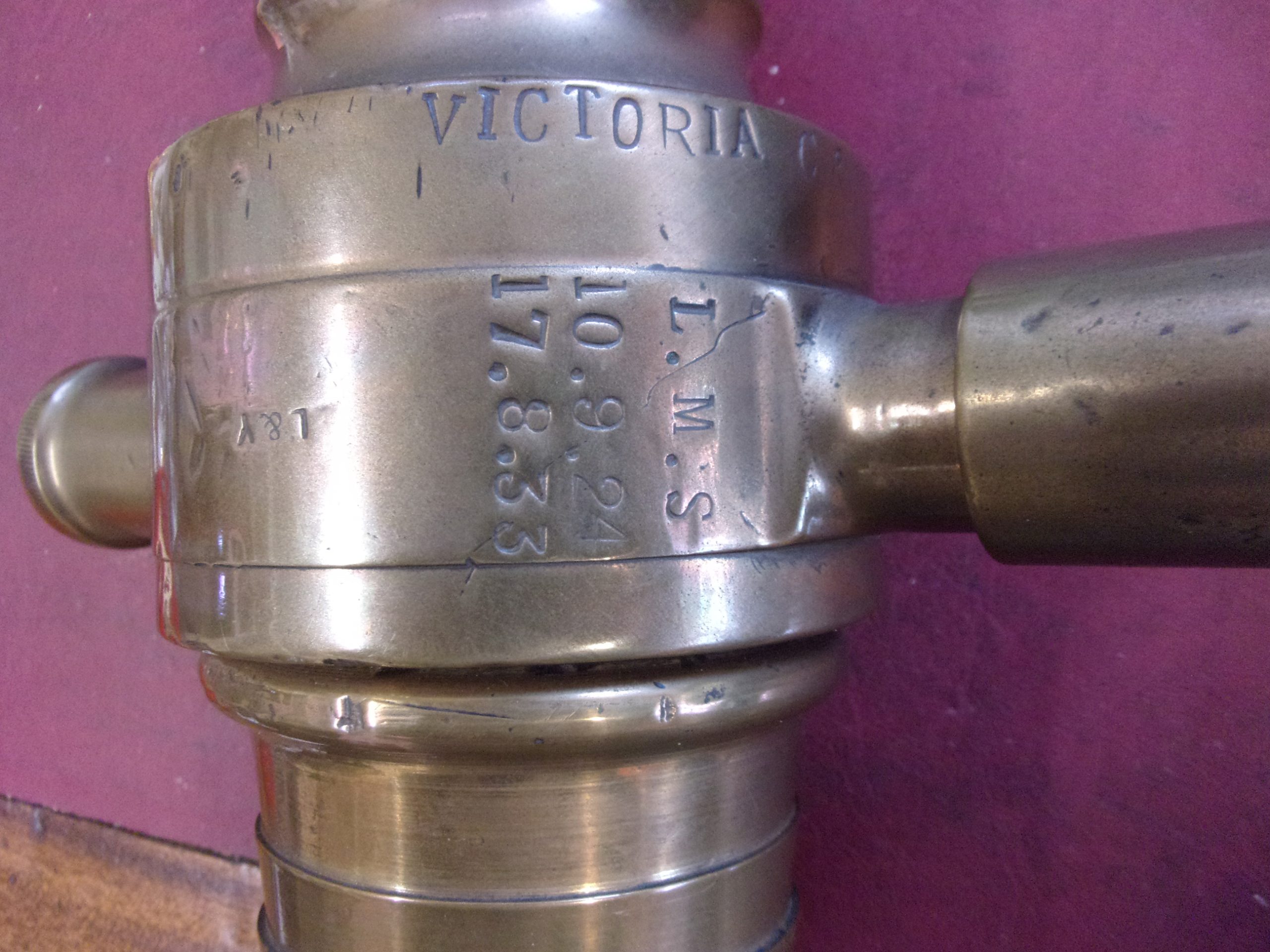 L&Y heavy brass Fire Hose Lock “L&Y Victoria” (Manchester Victoria Station”, also stamped “LMS10.924 17.8.33″. Service knocks & dings, nice piece of polished brass. 8″ x 8”. 2 1/2″ bore.