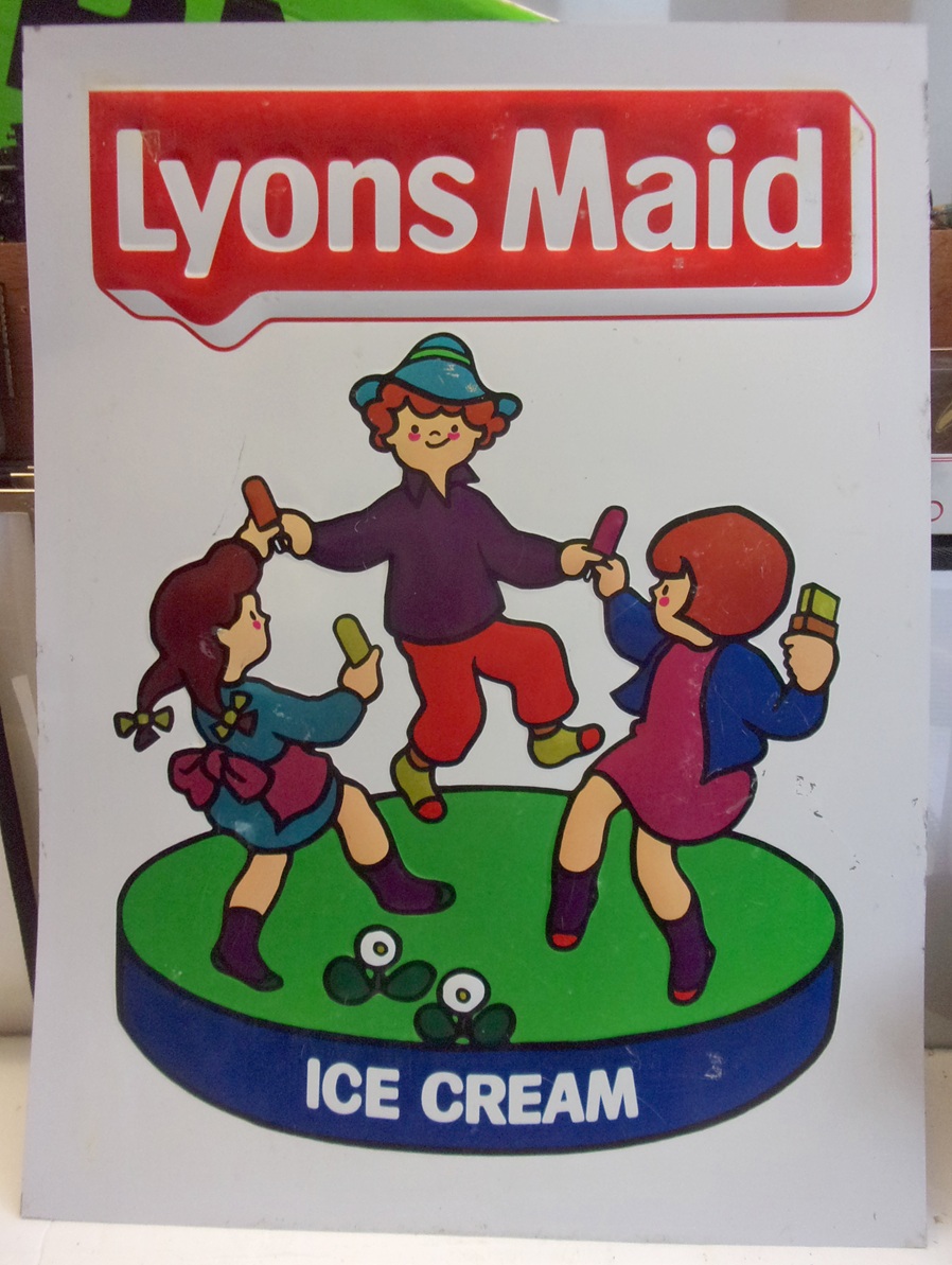 Lyons Main embossed tin plate advertising sign. Very good colours, little service wear, does not detract. 18″ x 24″.