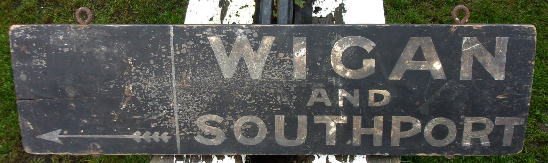L&YR Platform Indication Board, probably from Manchester Victoria “Wigan and Southport”, double sided, wooden construction, painted letters with hanging loops. 42″ x 11″.