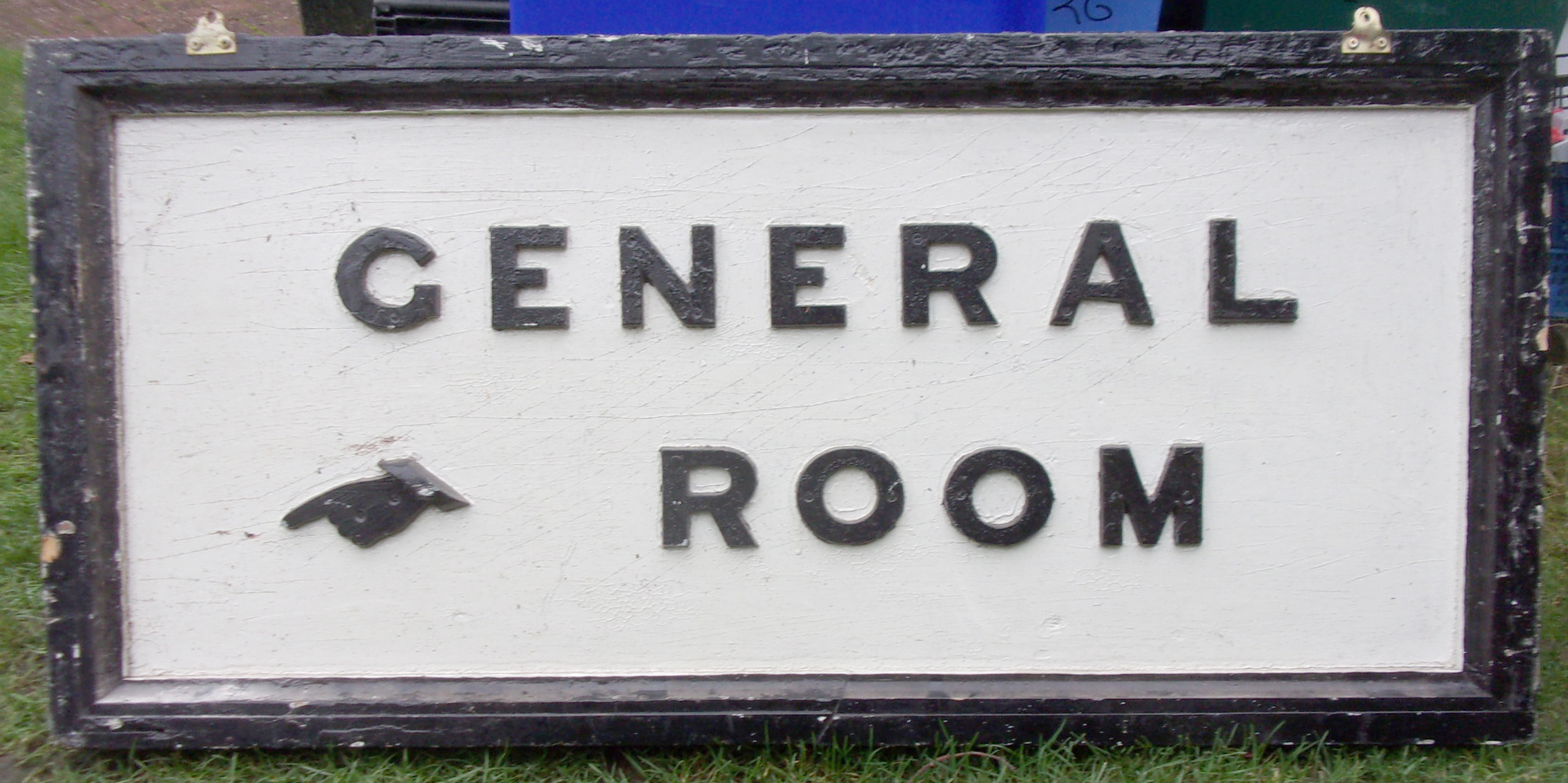 L&YR wooden station sign “GENERAL ROOM” with pointed hand. Double sided with metal letters. 2 x pictures to view.
