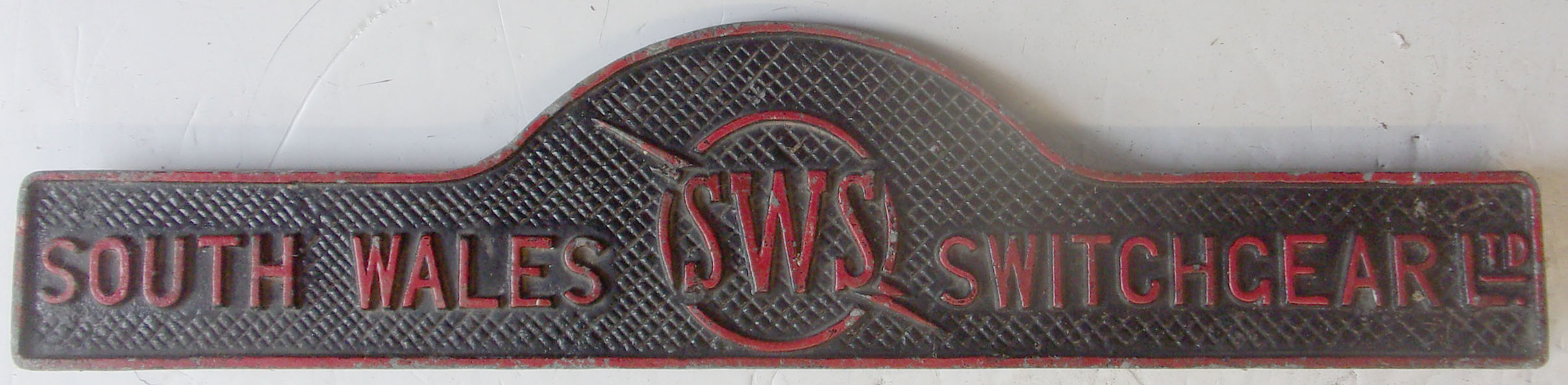 Makers Plate “South Wales Switchgear Ltd” 19 1/2″ x 4 1/2″, cast aluminium. Founded in 1941, became part of Hawker Siddeley, Switchgear Ltd 1991.
