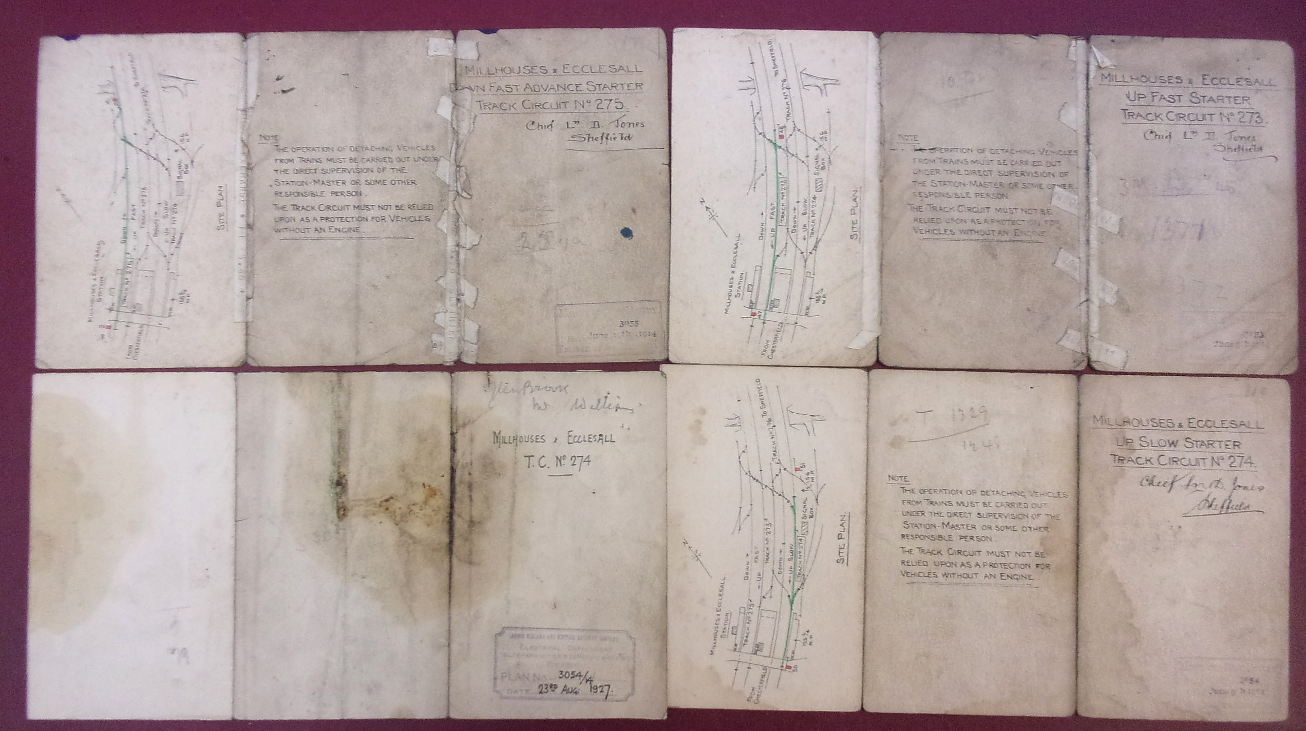 Midland Railway Millhouses & Eccleshall” pocket size signalling diagrams on folding card. 12″ x 6 1/2″. 4″ x 6 1/4″ when folded, double sided, dated 1914 and one 1927. ( 2 x images to view)