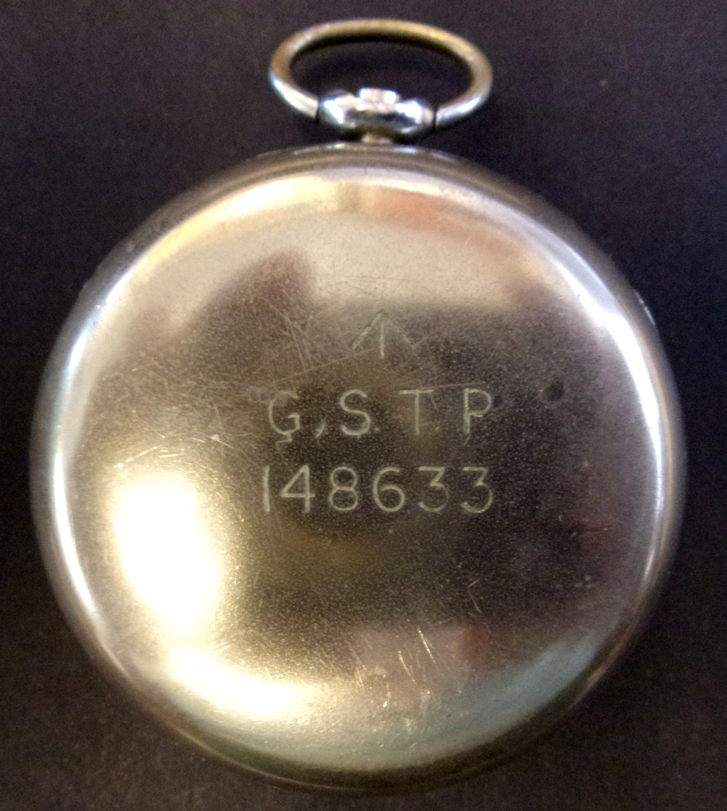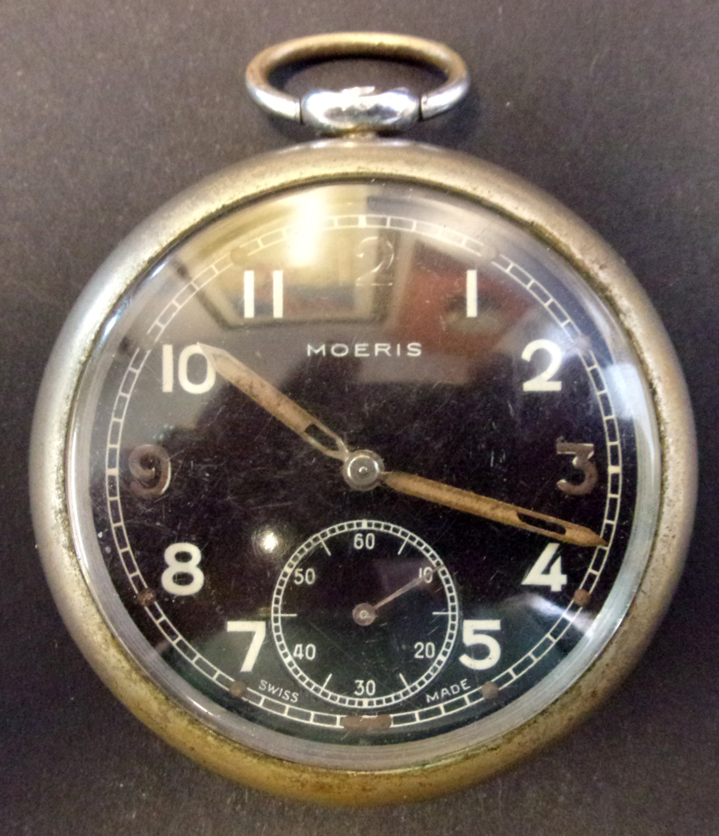 Military Pocket Watch by Moeris, needs attention, top winder absent, back engraved G.S.T.P 148633 with War Department Crows foot. ( 2 x images to view)