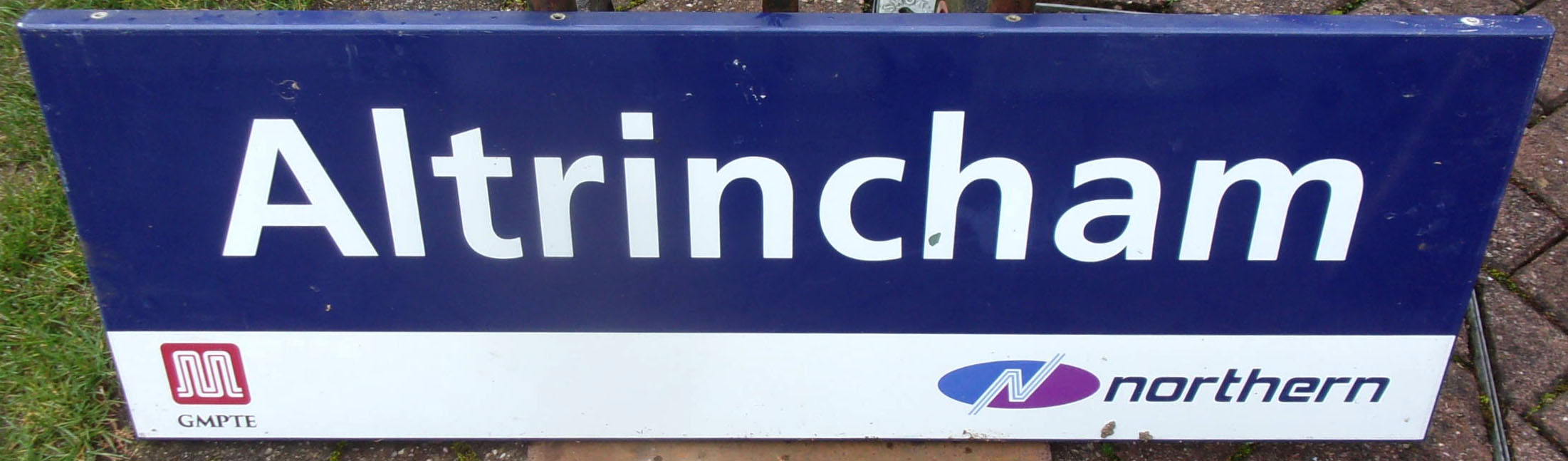 Modern Image Station Sign “Altrincham”. Located on the Manchester to Chester Line. 39″ x 14″. Ex service condition.