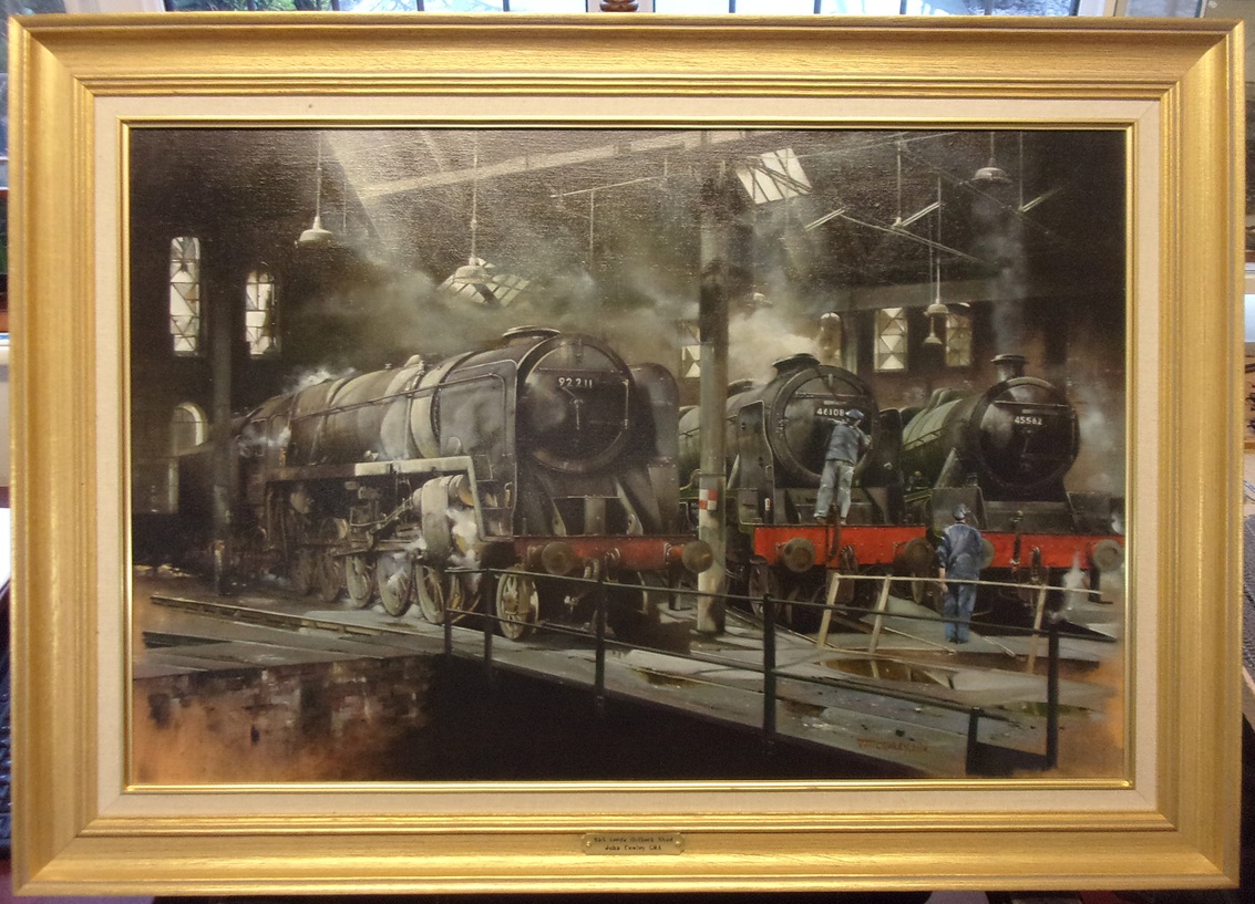 Original Artwork Oil on Canvas 55A Leeds Holbeck, image depicting locos at rest 9F “922211” Royal Scot “46108 Seaforth Highlanders” Jubilee 45562 Alberta by John Cowley, signed by John in 2004. Superb image, 30″ x 21″. Quality frame.