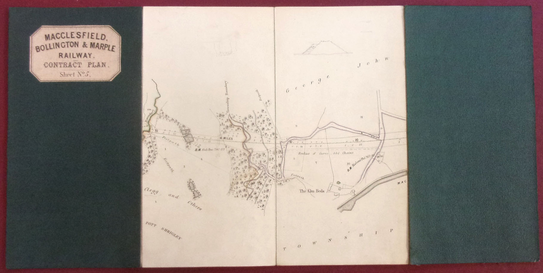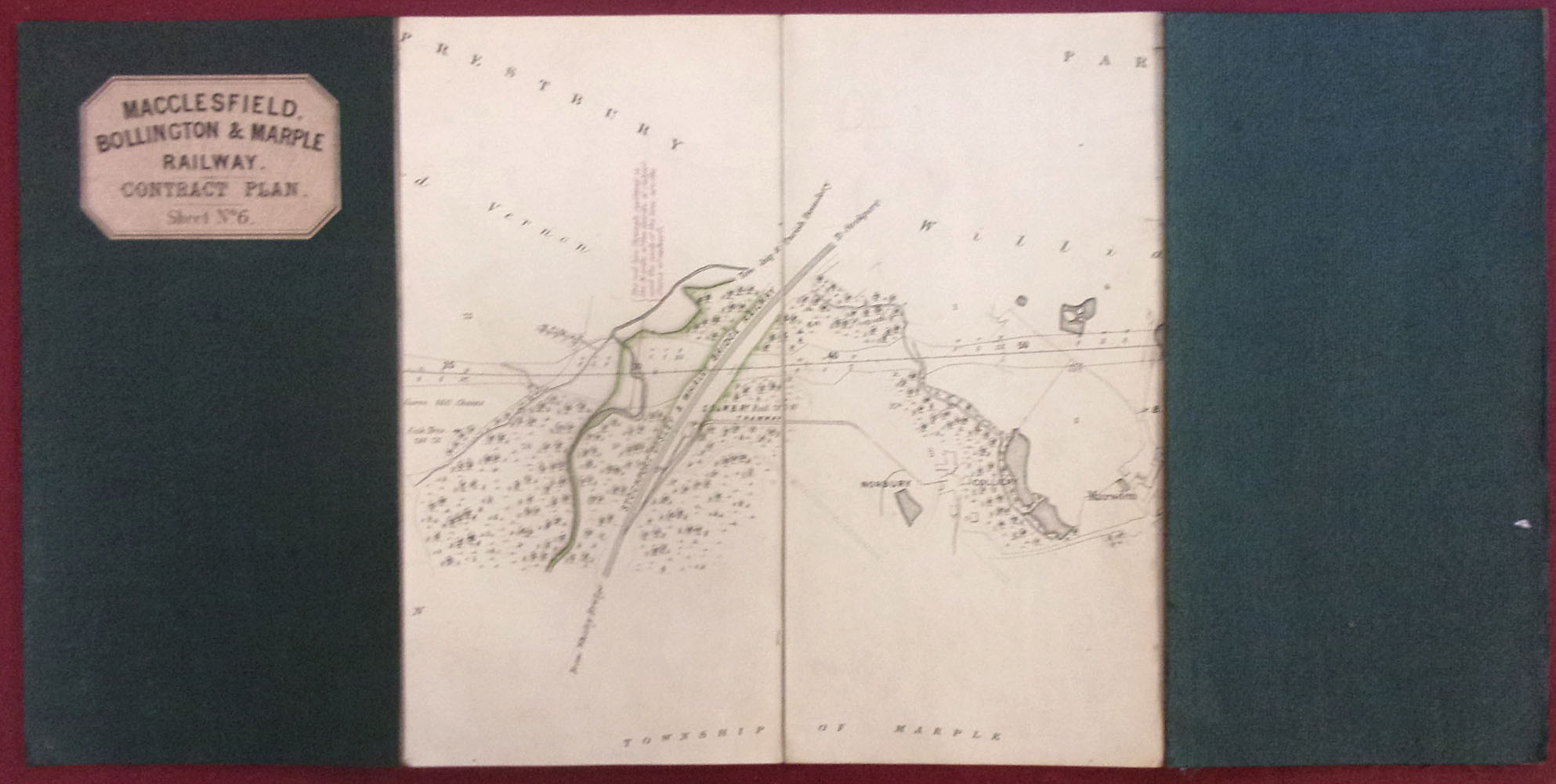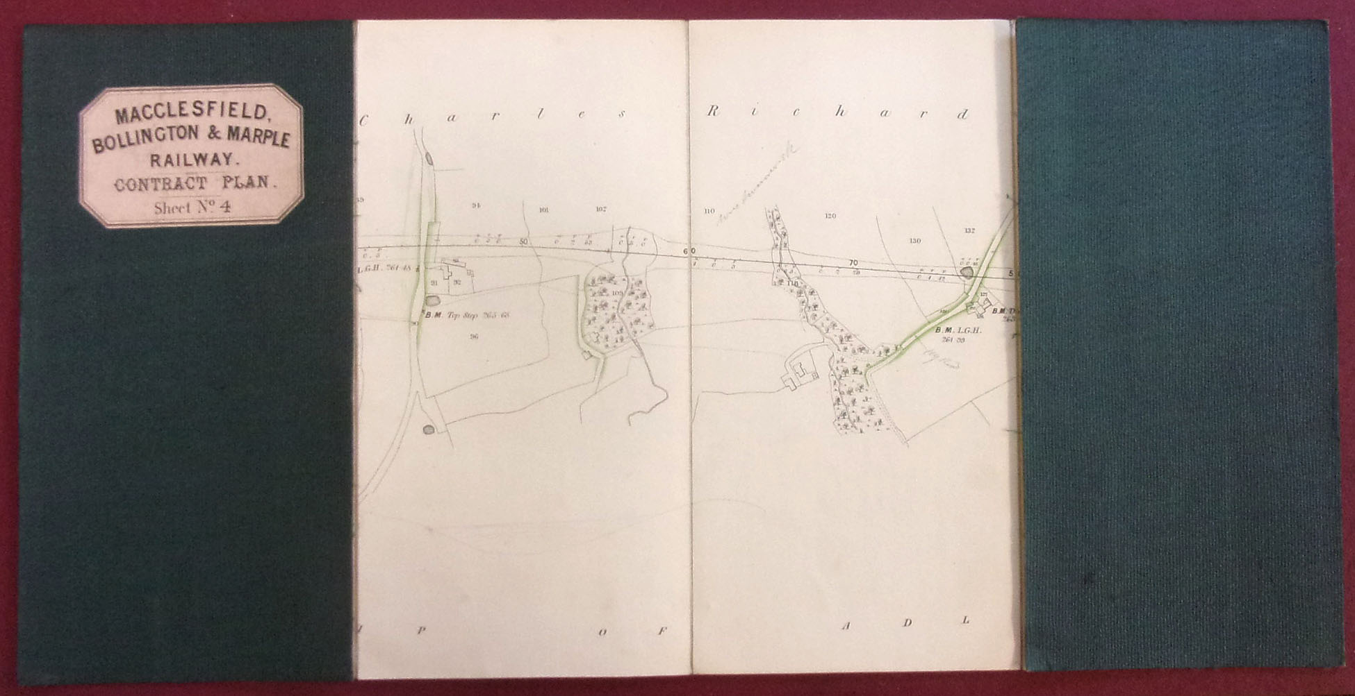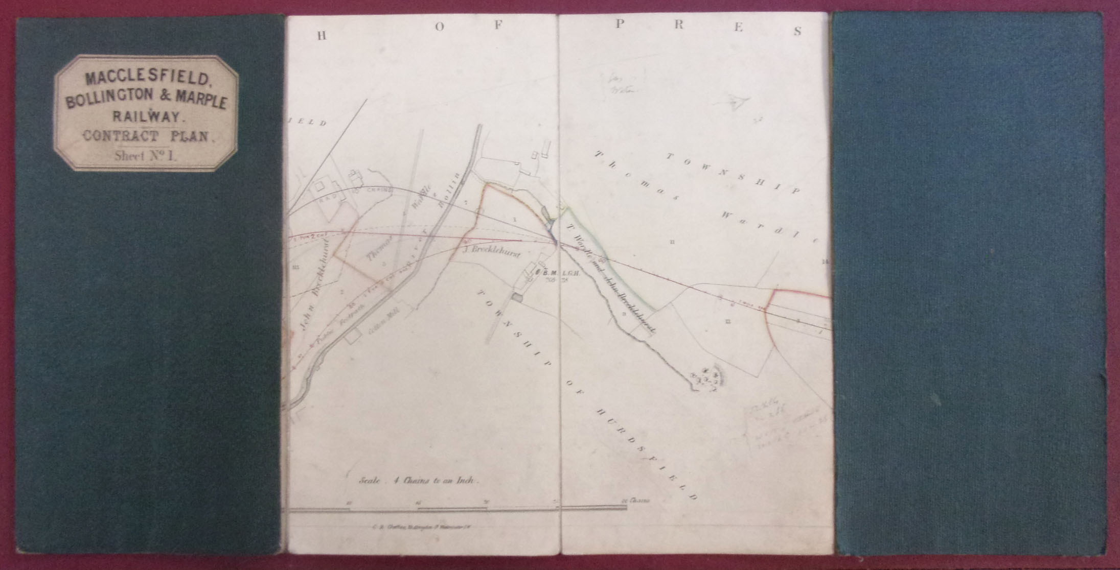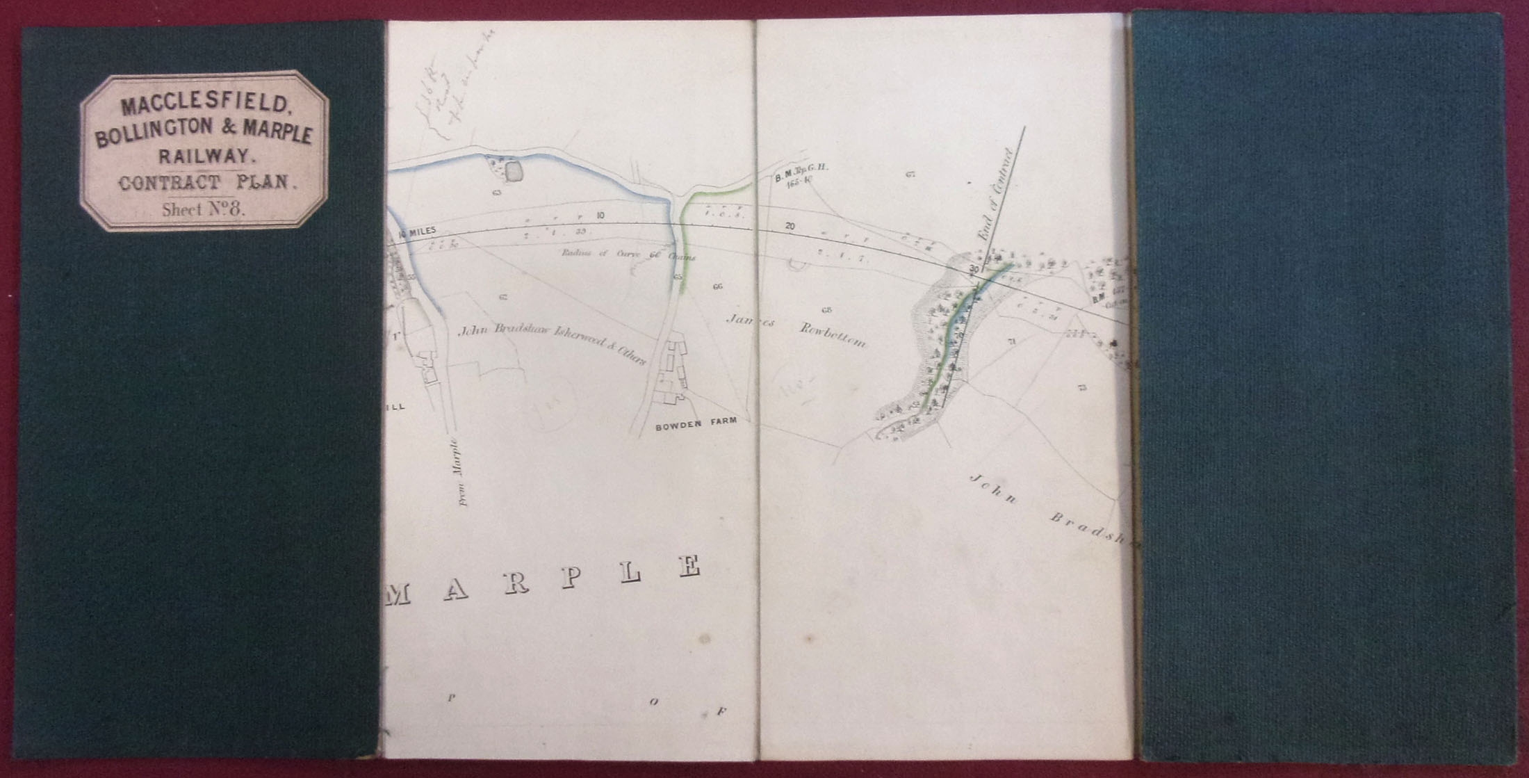 Original set of plans for the Macclesfield, Bollington & Marple Railway, Act of Parliament was passed 1864. The lines single track at first opened in 1869. These drawings show route of line with the townships and landowners. This set of 8 drawings are linen, backed on card and concertened neatly fitting into a heavy card case, each drawing is 30″ x 10″. Full set showing complete route. 8 x maps, 1 x outer case. A very rare archive.