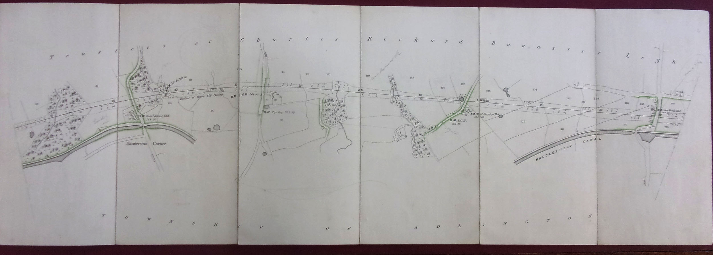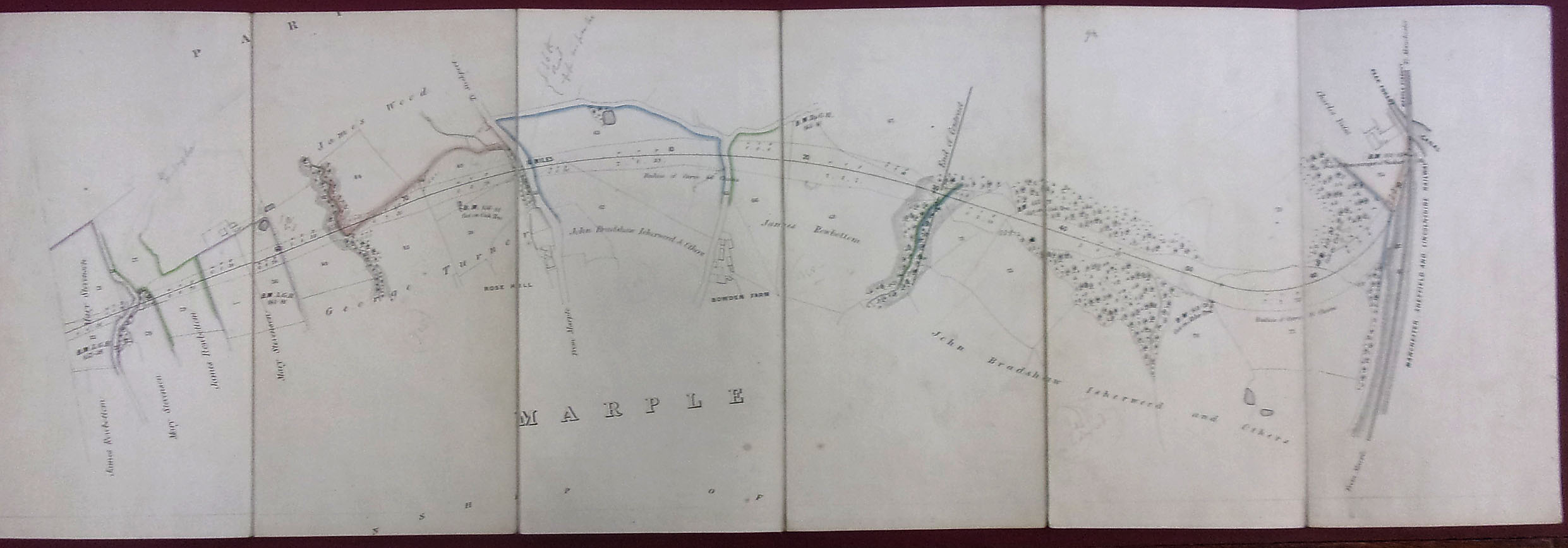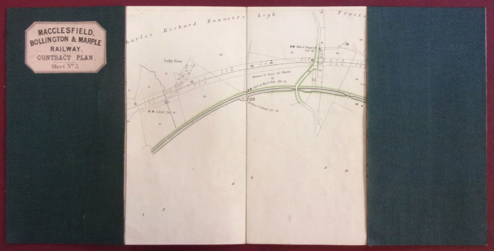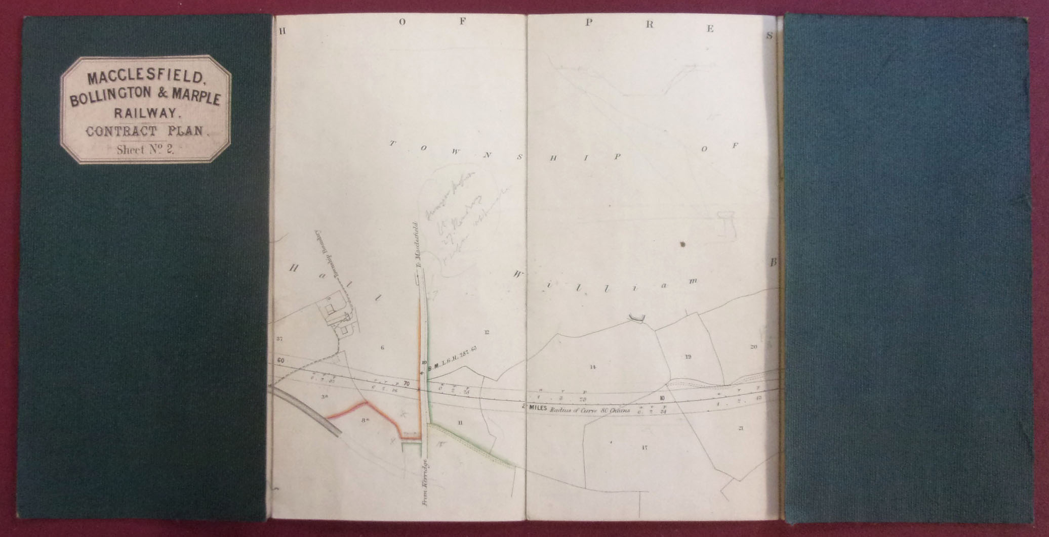 Original set of plans for the Macclesfield, Bollington & Marple Railway, Act of Parliament was passed 1864. The lines single track at first opened in 1869. These drawings show route of line with the townships and landowners. This set of 8 drawings are linen, backed on card and concertened neatly fitting into a heavy card case, each drawing is 30″ x 10″. Full set showing complete route. 8 x maps, 1 x outer case. A very rare archive.