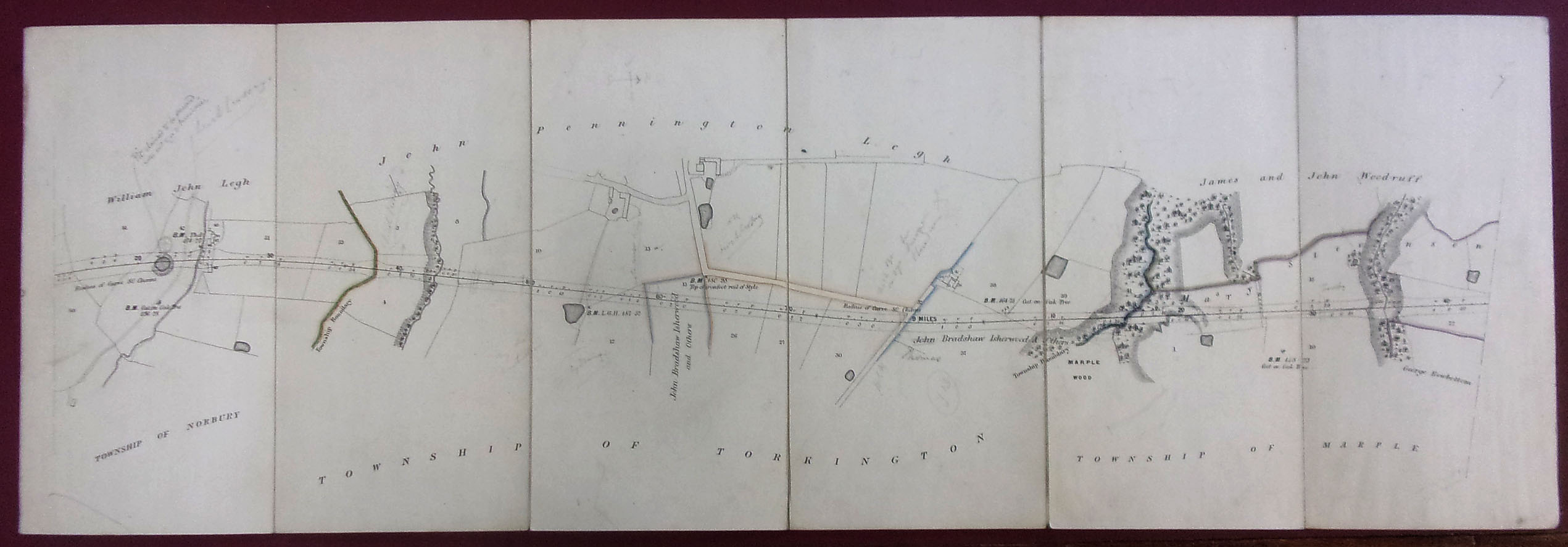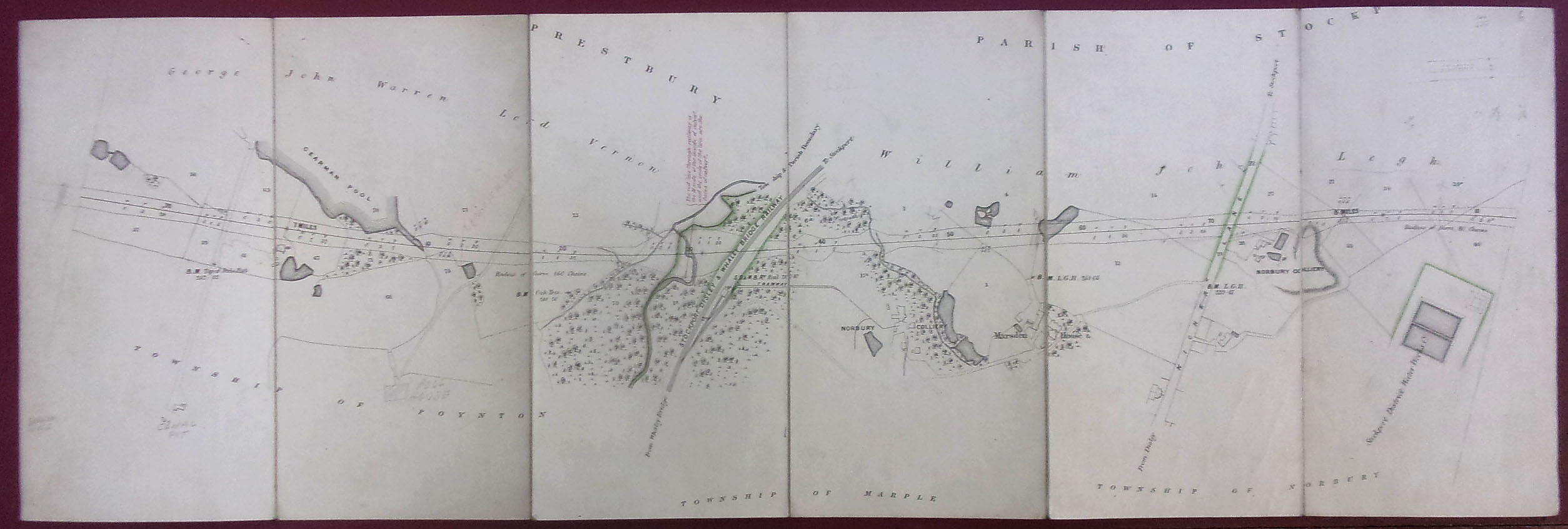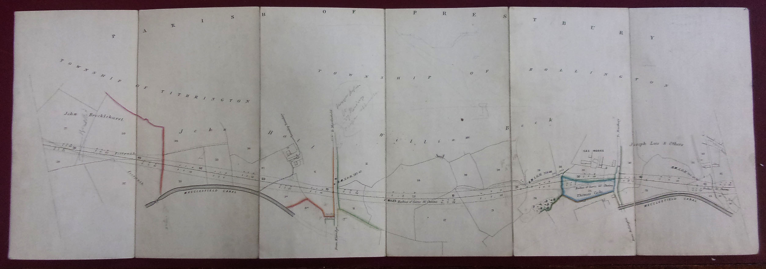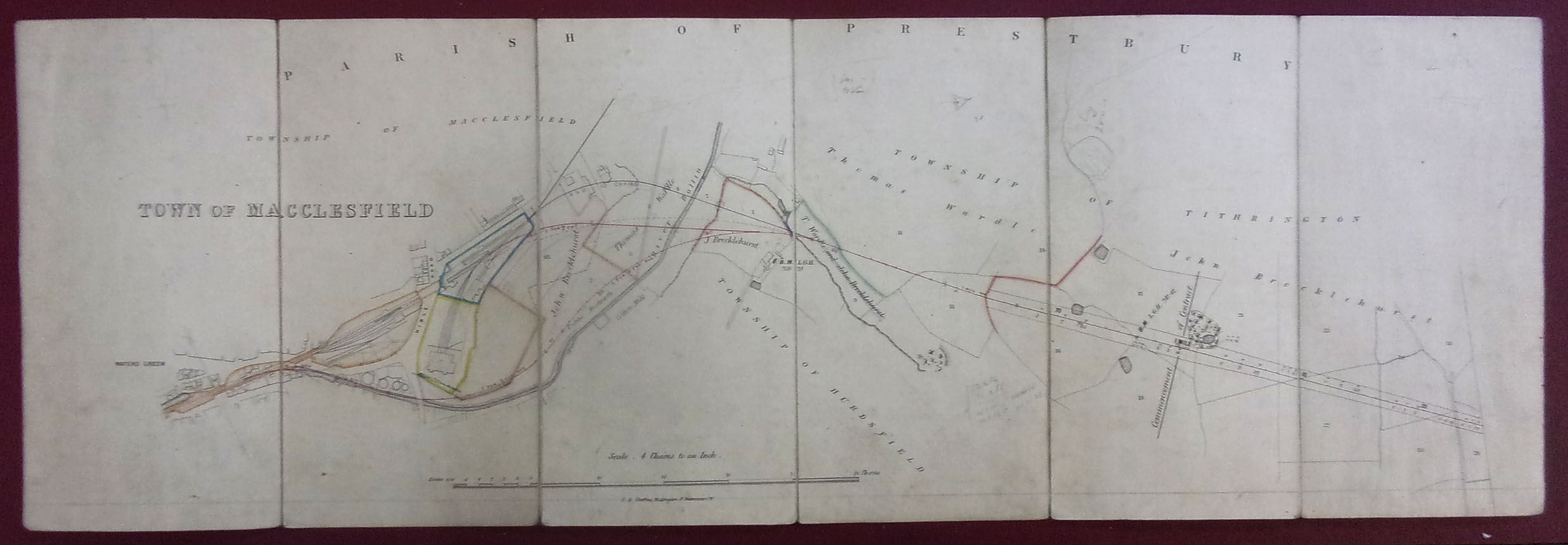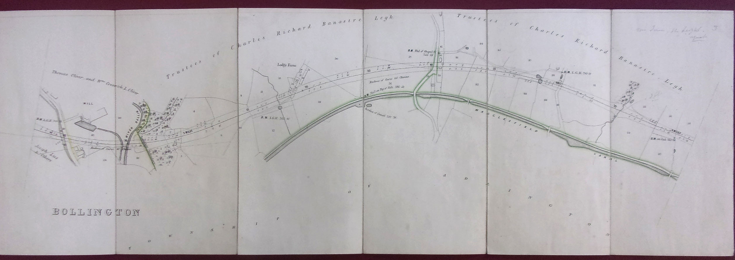 Original set of plans for the Macclesfield, Bollington & Marple Railway, Act of Parliament was passed 1864. The lines single track at first opened in 1869. These drawings show route of line with the townships and landowners. This set of 8 drawings are linen, backed on card and concertened neatly fitting into a heavy card case, each drawing is 30″ x 10″. Full set showing complete route. 8 x maps, 1 x outer case. A very rare archive.
