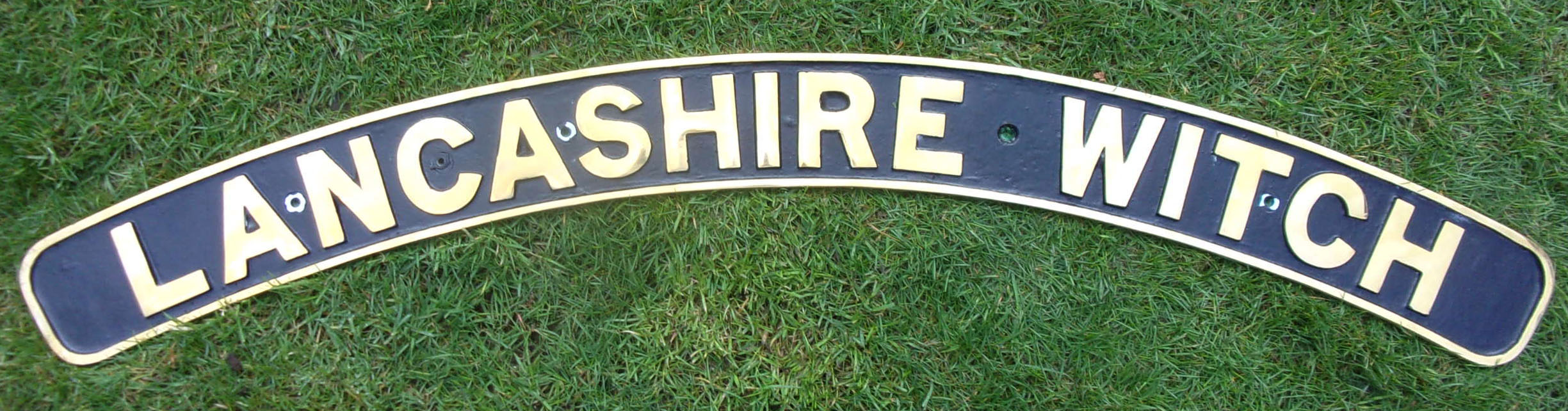 Reproduction Nameplate as Royal Scot Class “LANCASHIRE WITCH” 6125. Embossed cast brass “46” x 4″.