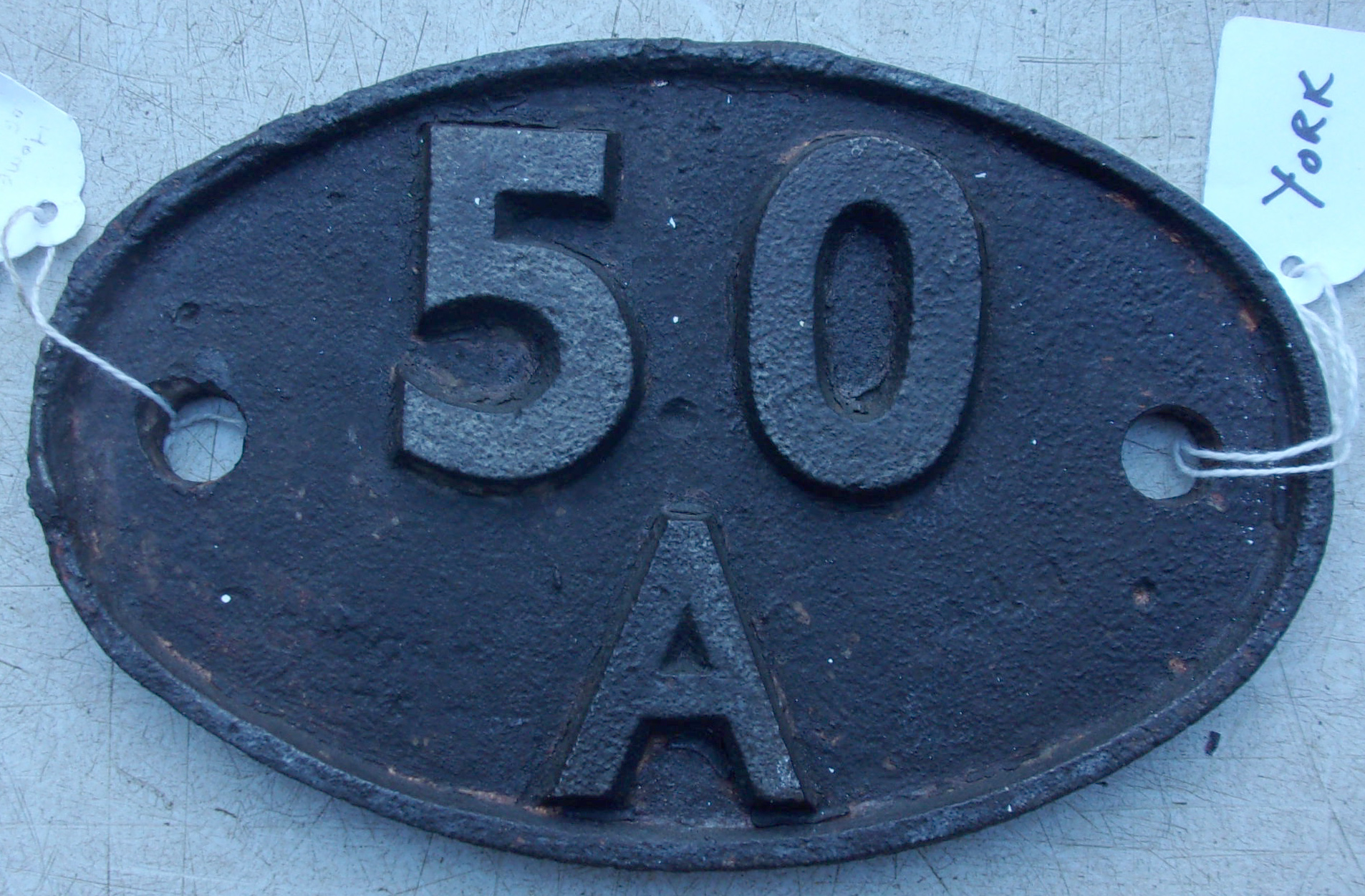Shed plate “50A” York 1948-1967, ex NER depot with an allocation of approx. 180 locos plus, including Pacifics, Hunts, etc. Ex loco condition. 2 x pictures to view.