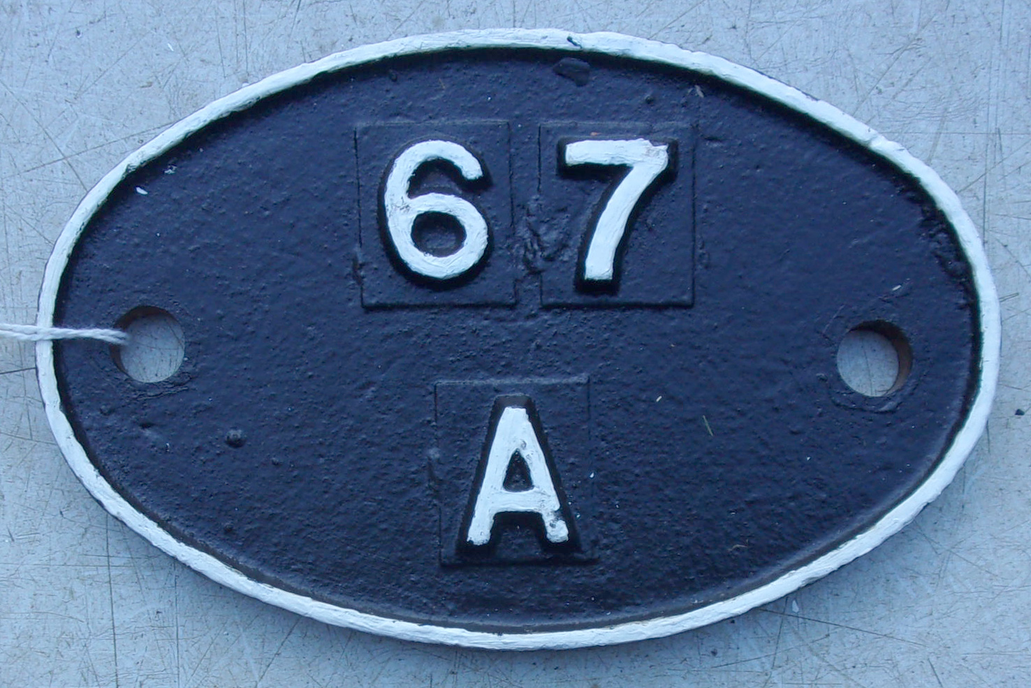 Shedplate “67A” Corkerhill 1948-1973. Ex GSWR depot with an allocation of 90 plus locos, including Jubilees. Repainted face, ex loco back. 2 x pictures to view.