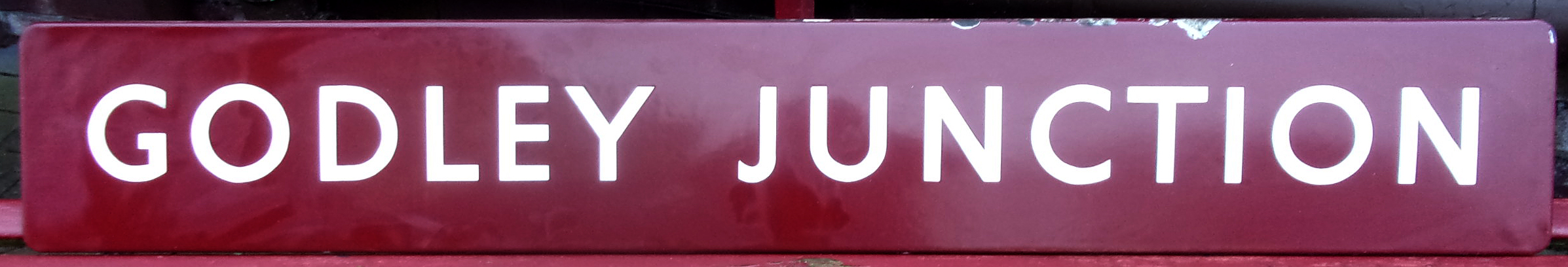 Signal Box Nameboard “Godley Junction” BR(M) FF. Good colour & shine, some edge chipping to top flange, does not detract. Godley Junction was located at the intersection connecting the Woodhead Line with the Cheshire Lines Committee Route. 68″ x 10″.