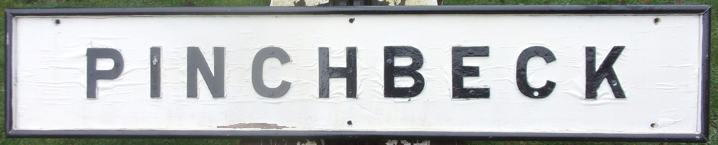 Signal Box Nameboard “Pinchback”. 66″ x 12″. Sound, no rot, paint lifting to face.