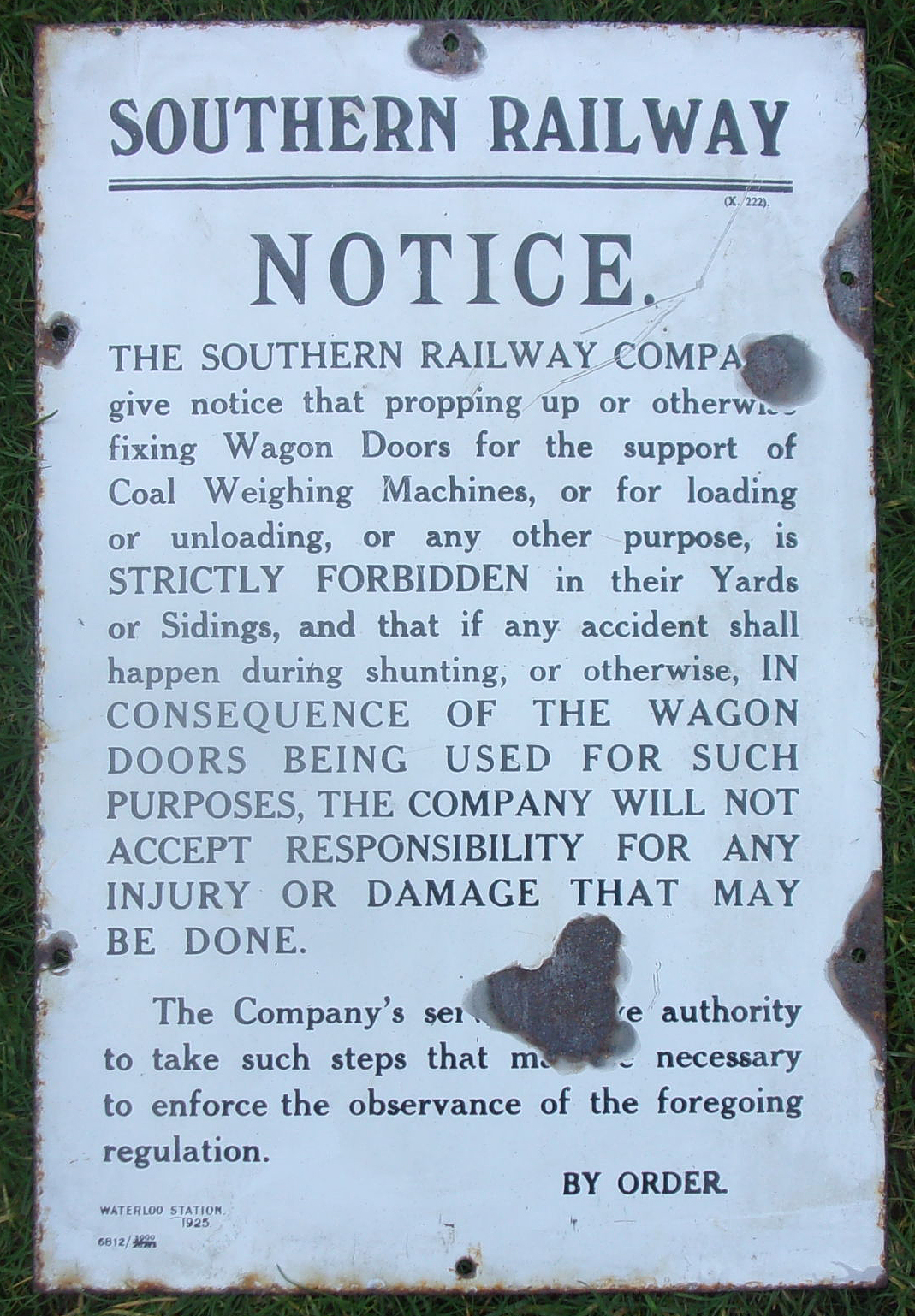 Southern Railway enamel sign “Southern Railway Notice”. Good colour & shine. 12″ x 18″. Some loss of enamel as pictured.
