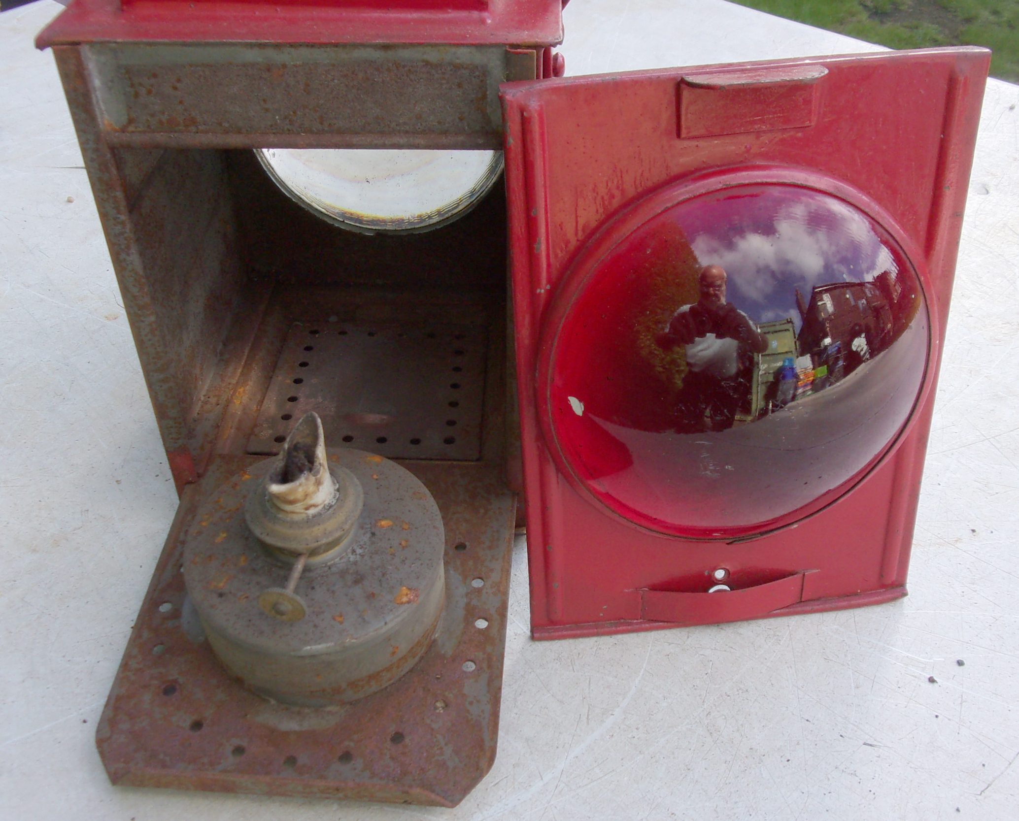 Splitter Lamp, complete with correct vessel & burner, red & clear bullseye lens, clean. In very good condition. Makers plate to chimney “Linley Engineering Co. Birmingham”.