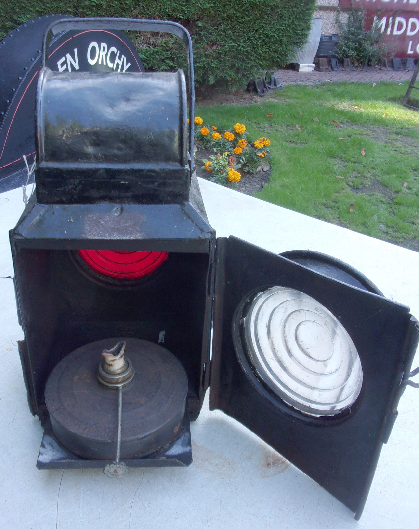 Unidentified Tail Lamp with coweled lenses, both bullseyes, complete with correct vessel & burner. Good condition.