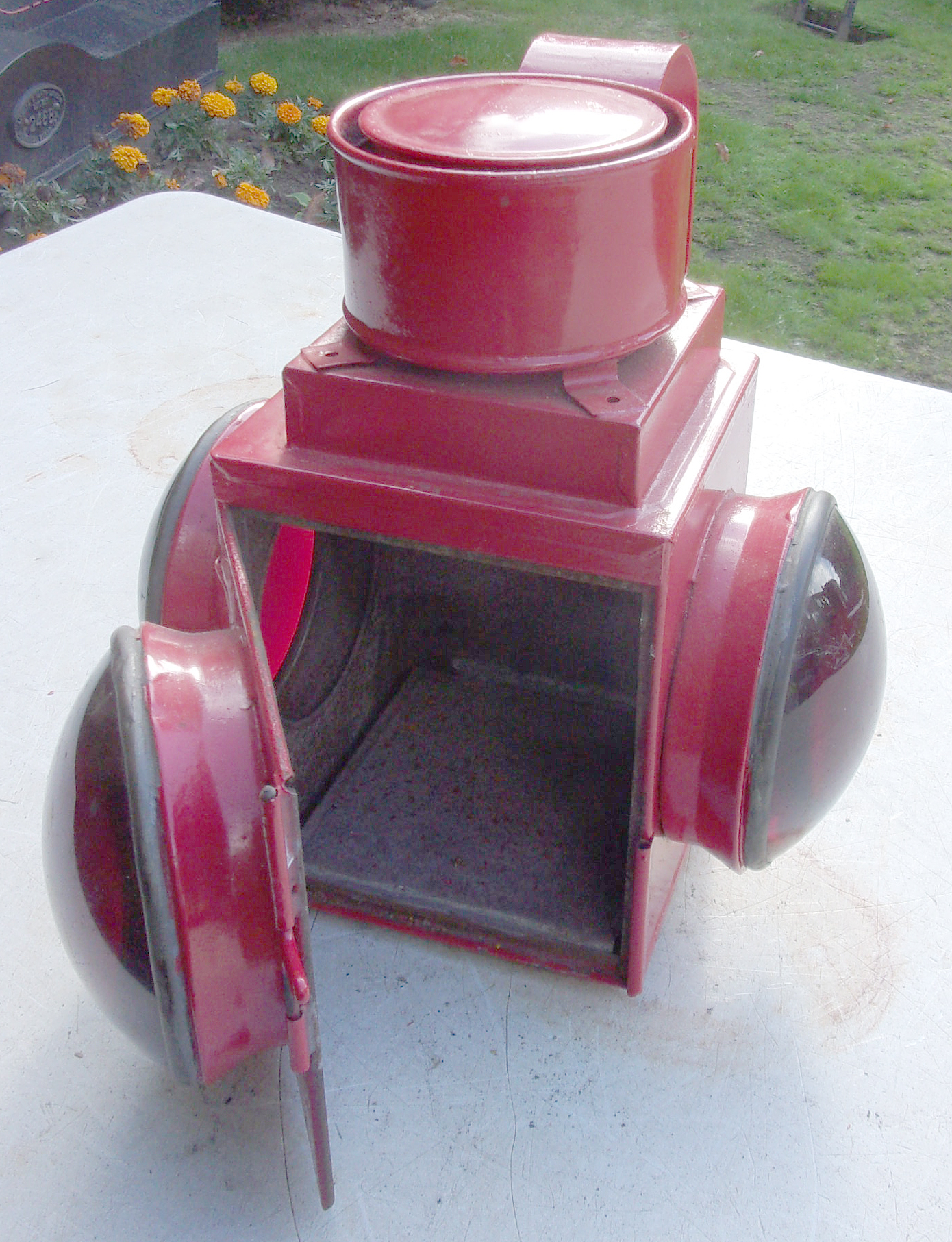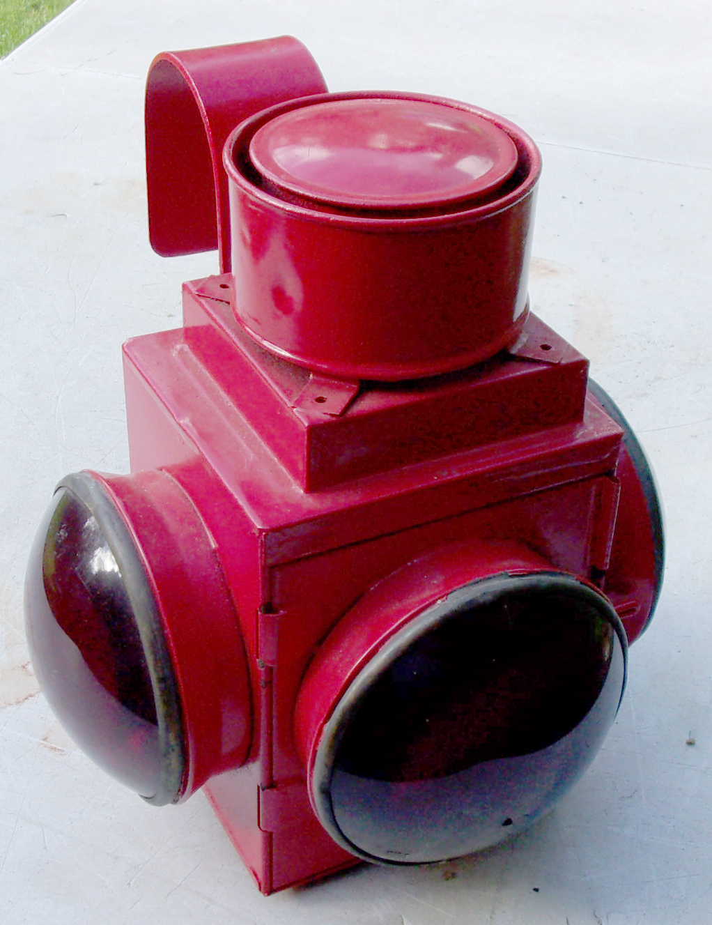 Unusual Crossing Gate or Temporary Warning Danger Lamp, 3 x large red bullseye lenses, all very good. Hook to rear, we assume to just hook over the gate etc. Not as a permanent feature. 2 x images to view.