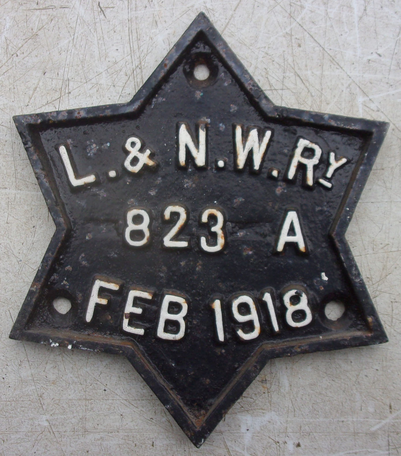 Wagon Plate “L&NWRY 823 A Feb 1918”. Star Plate. Repainted face.