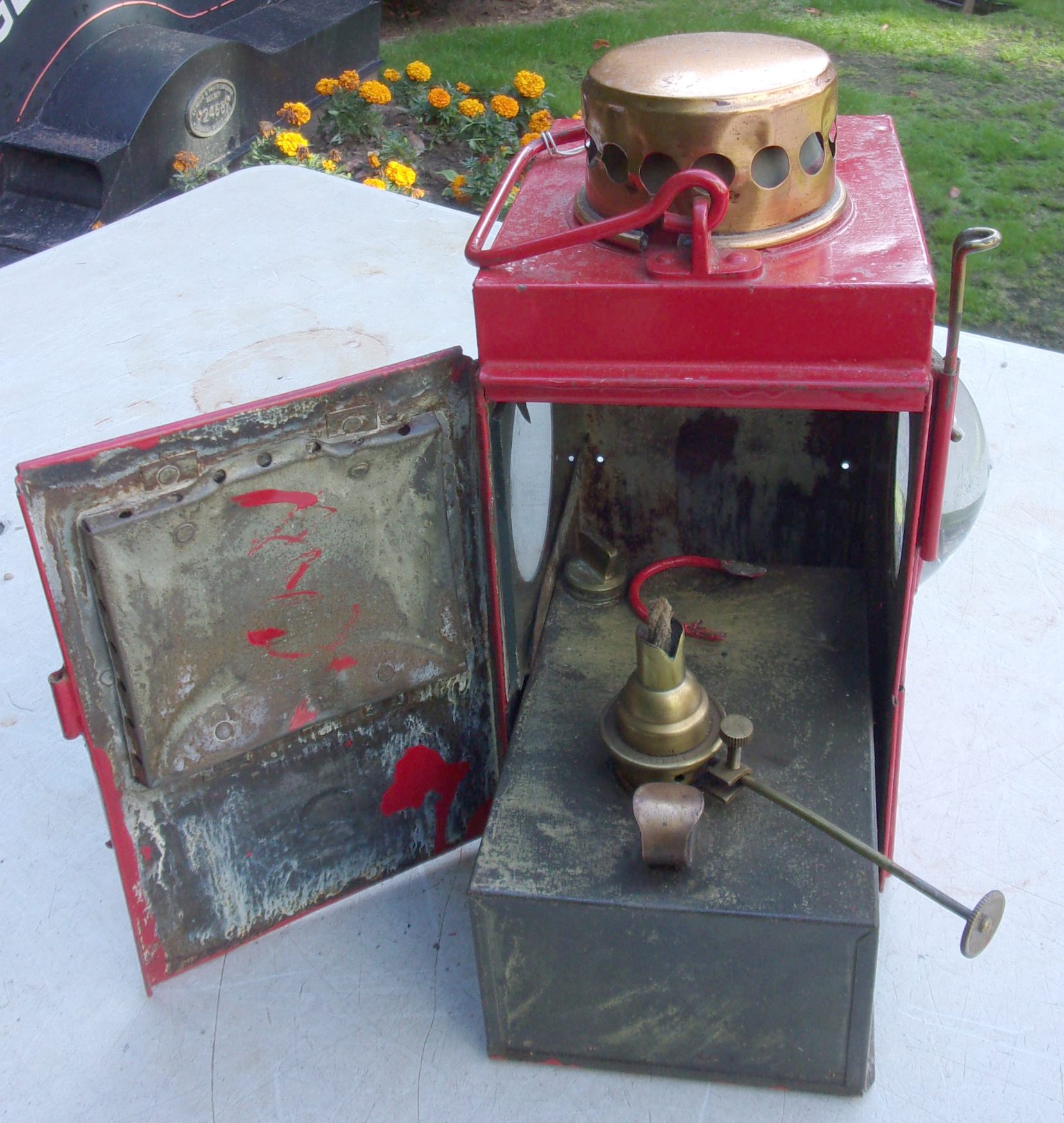 Welsh pattern signal lamp interior with correct vessel & burner, lovely condition. Door handle detached is present inside case, off set bullseye lens, copper chimney, nameplate to side.