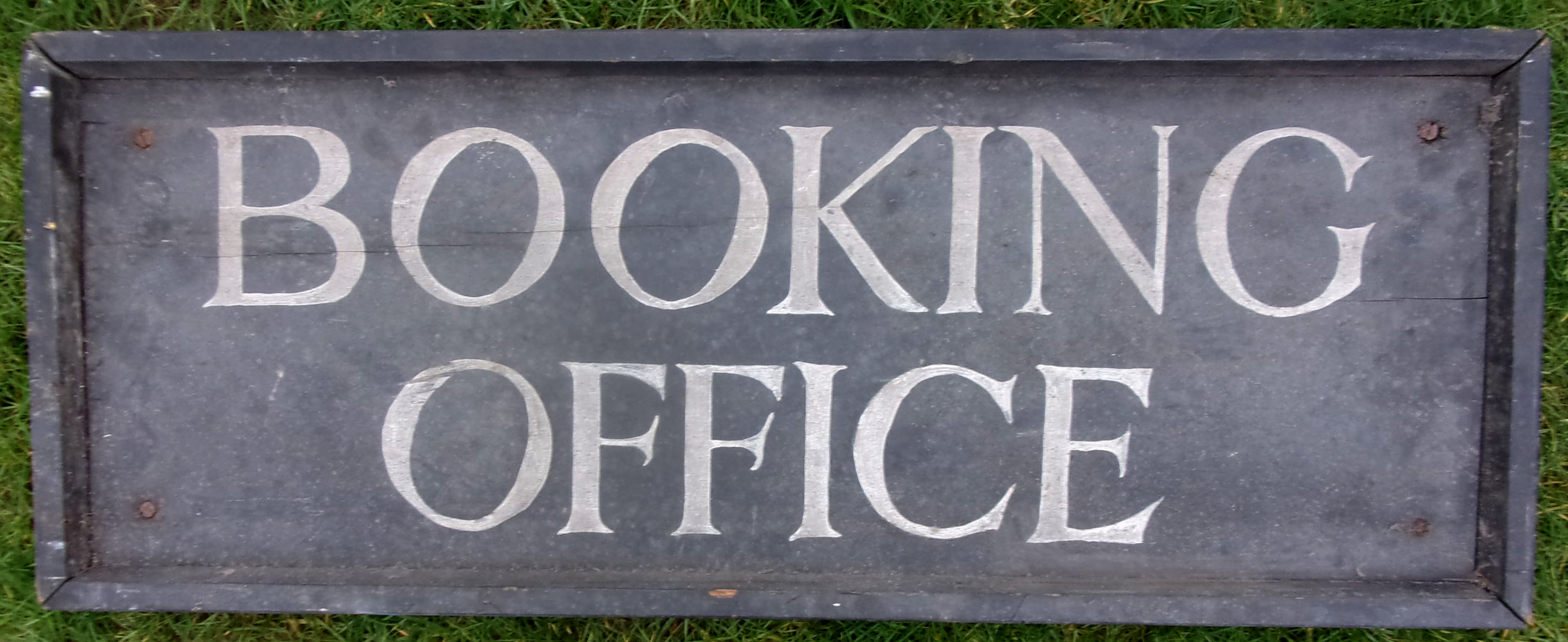 Wooden Sign “Booking Office”, unknown if it is Railway connected, but is solidly made, old style and came with items for Dinting Railway Centre. 30″ x 12″. Sound, no rot. 2 x pictures to view.
