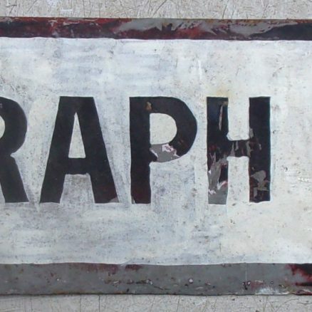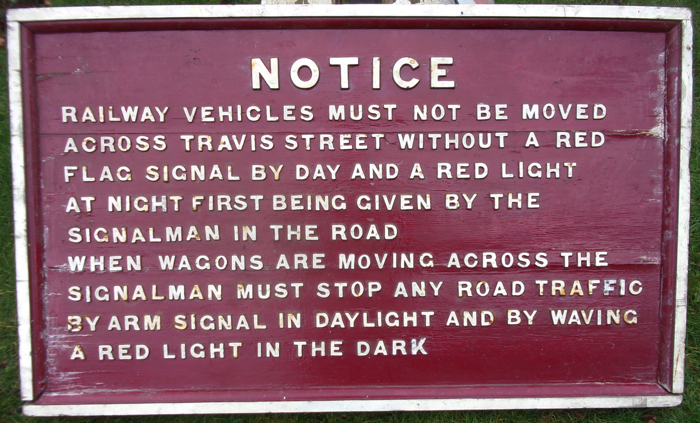 Wooden sign with metal letters “Notice” ref to moving vehicles across Travis St, Manchester. In very good condition, considering age it was made.