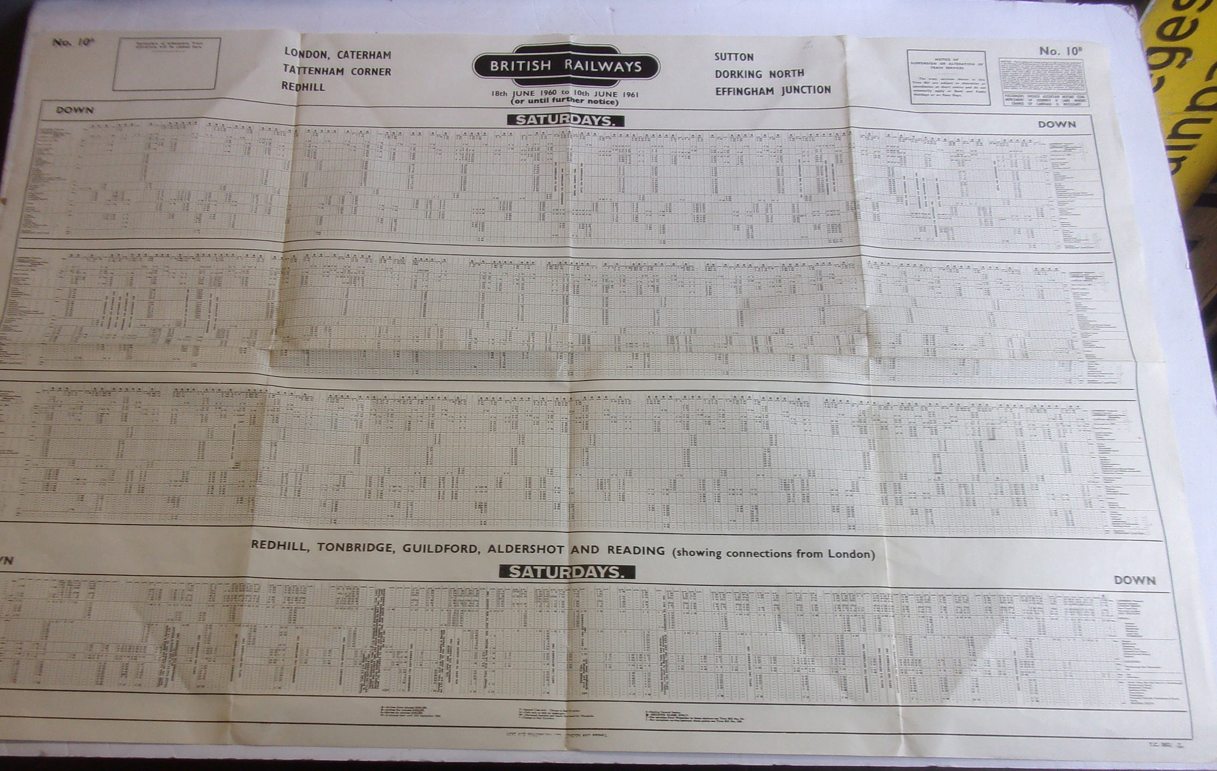 BR TIMETABLE LETTER PRESS, SATURDAY 18TH JUNE 1960, NO.10, 42″ x 28″. PERFECT CONDITION, FOLDED. | View/Bid |