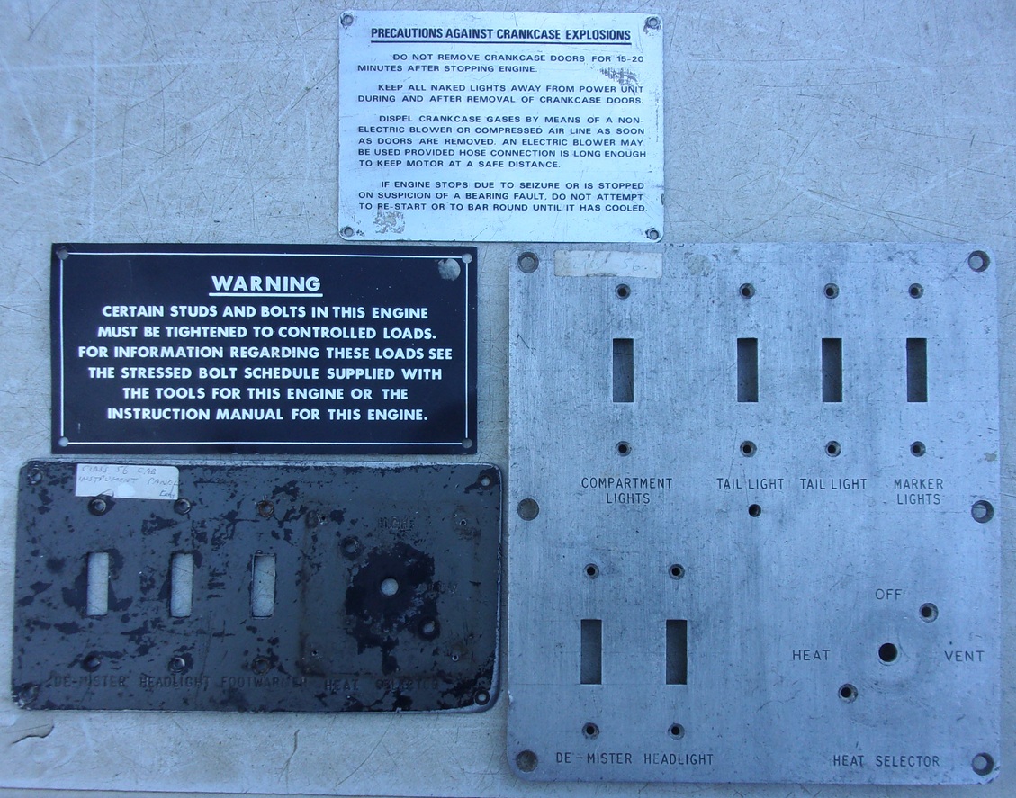 4 x INSTRUMENT METAL PLATES, retrieved from diesel loco, precautions crankcase plate ex 47, large aluminium switch backplate ex 56, heater switch backplate ex 56. Warning sign ex 60, as pictured. | View/Bid |