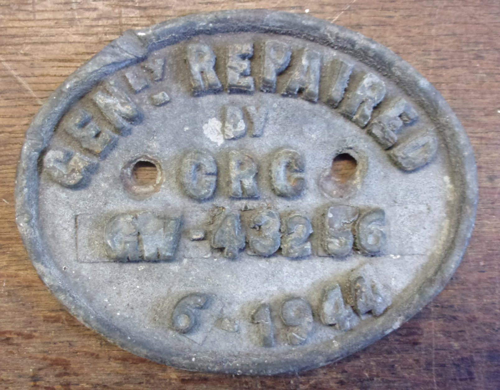 Locomotive Worksplate “Robert Stephenson & Hawthorns Ltd. Newcastle Works 7298 1946″, as carried by 0-6-0 Saddle Tank Std gauge, worked at Moira Cadley & Castle Gresley Colliery. Ex loco, loss to left hand bolt hole. 13″ x 8 1/2”. Cast iron. | £60.00 |