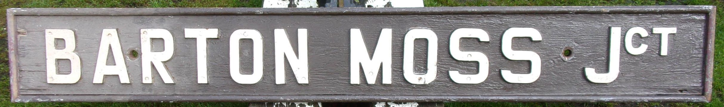 Signal box Nameboard “Barton Moss Jct” wooden with white metal letters, sound condition. Located on the Liverpool-Manchester Line over what is now called Chattmoss. | Make An Offer |