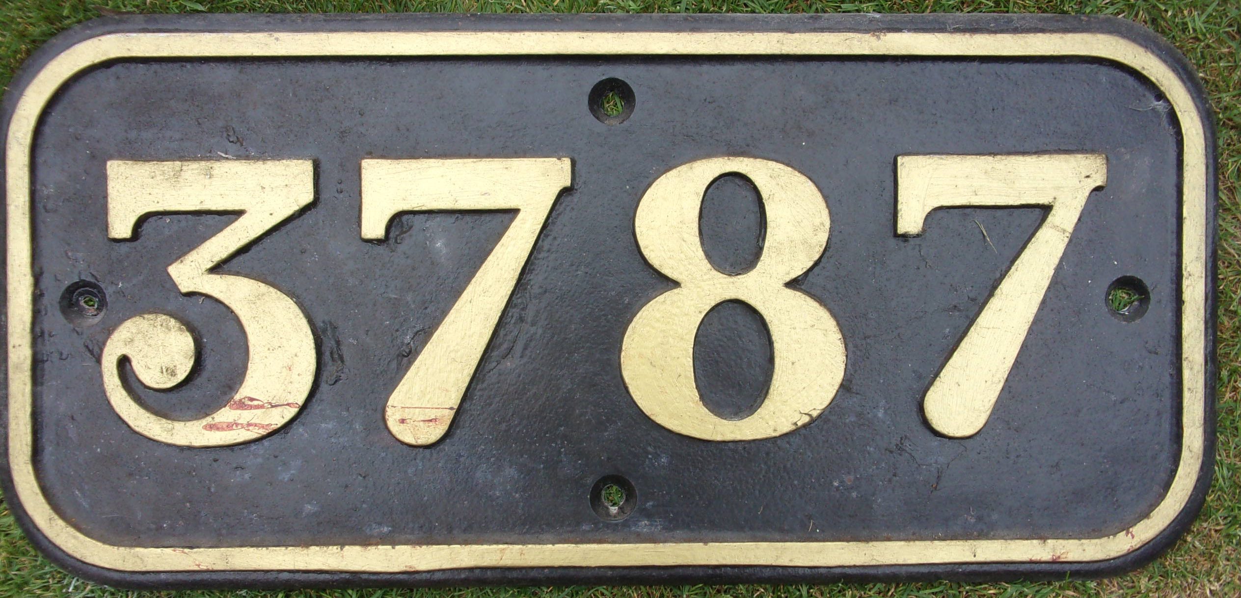 GWR Locomotive Cabside Numberplate “3787”, as carried by Collett Class 57XX 0-6-0 Pannier Tank, built Swindon Works. Emerging to traffic in 1938, allocations included Laira, Taunton, Westbury. Withdrawn January 1963. Cast iron, repainted face. | £200.00 |