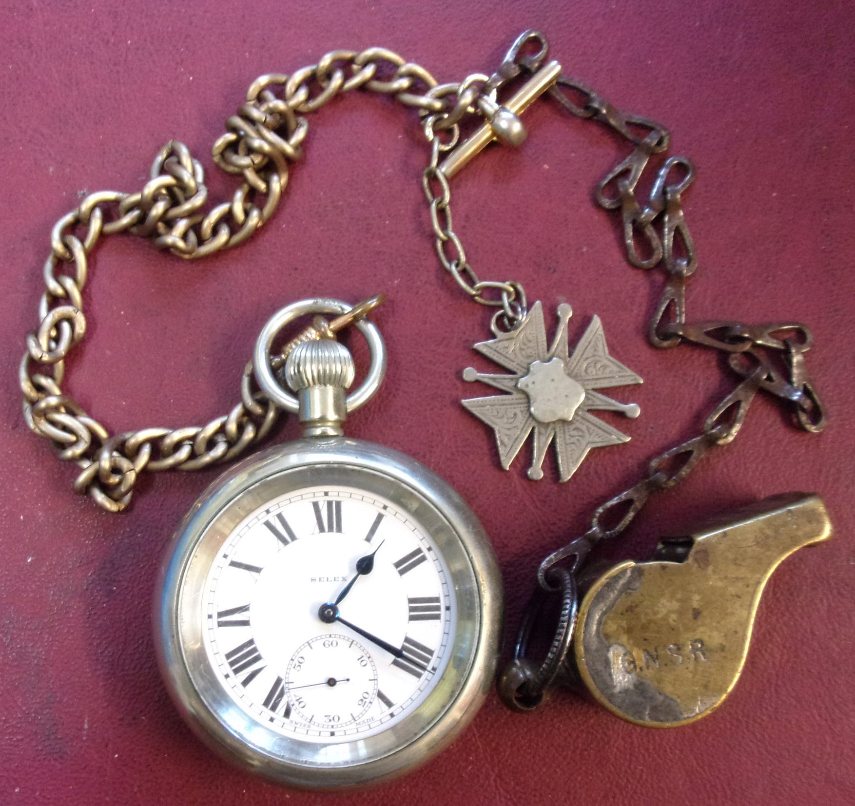 LNER Pocket Watch & Chain with fob by Selex “LNER 7693”, accompanied by Thunderer Whistle engraved “GNSR” with chain attached. Both fully working . | Make An Offer |