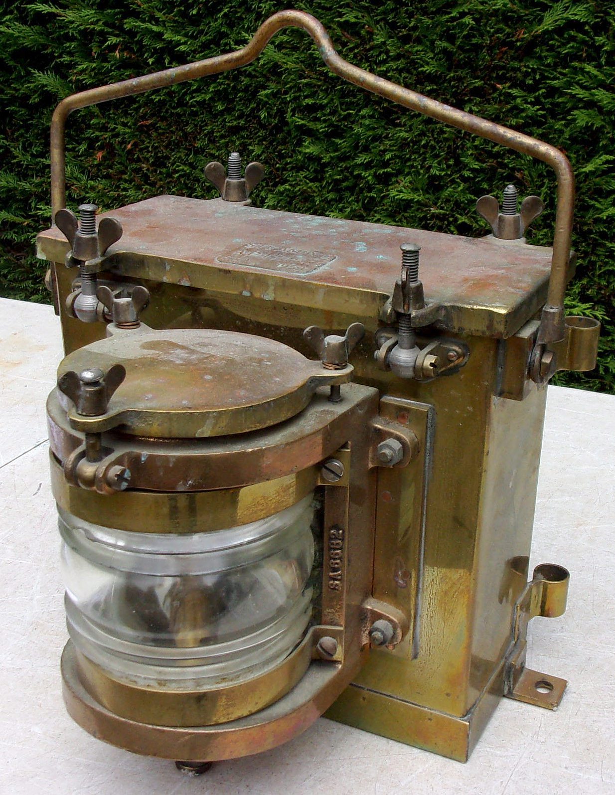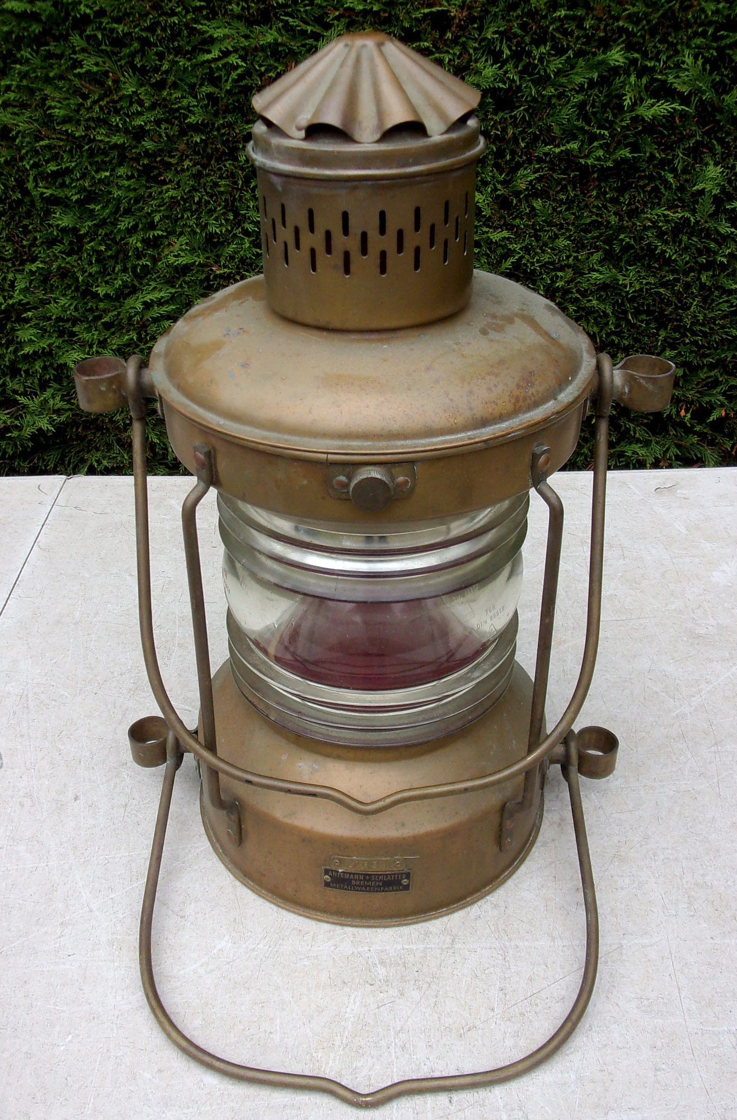 Ships Lantern – Perfect condition labelled “Z18548” makers plate “AHLEMANN&SCHLATTER BREMAN METALLWARENFABRIK”. 19″ x 13″. Brass, glass very good, red. | £30.00 |