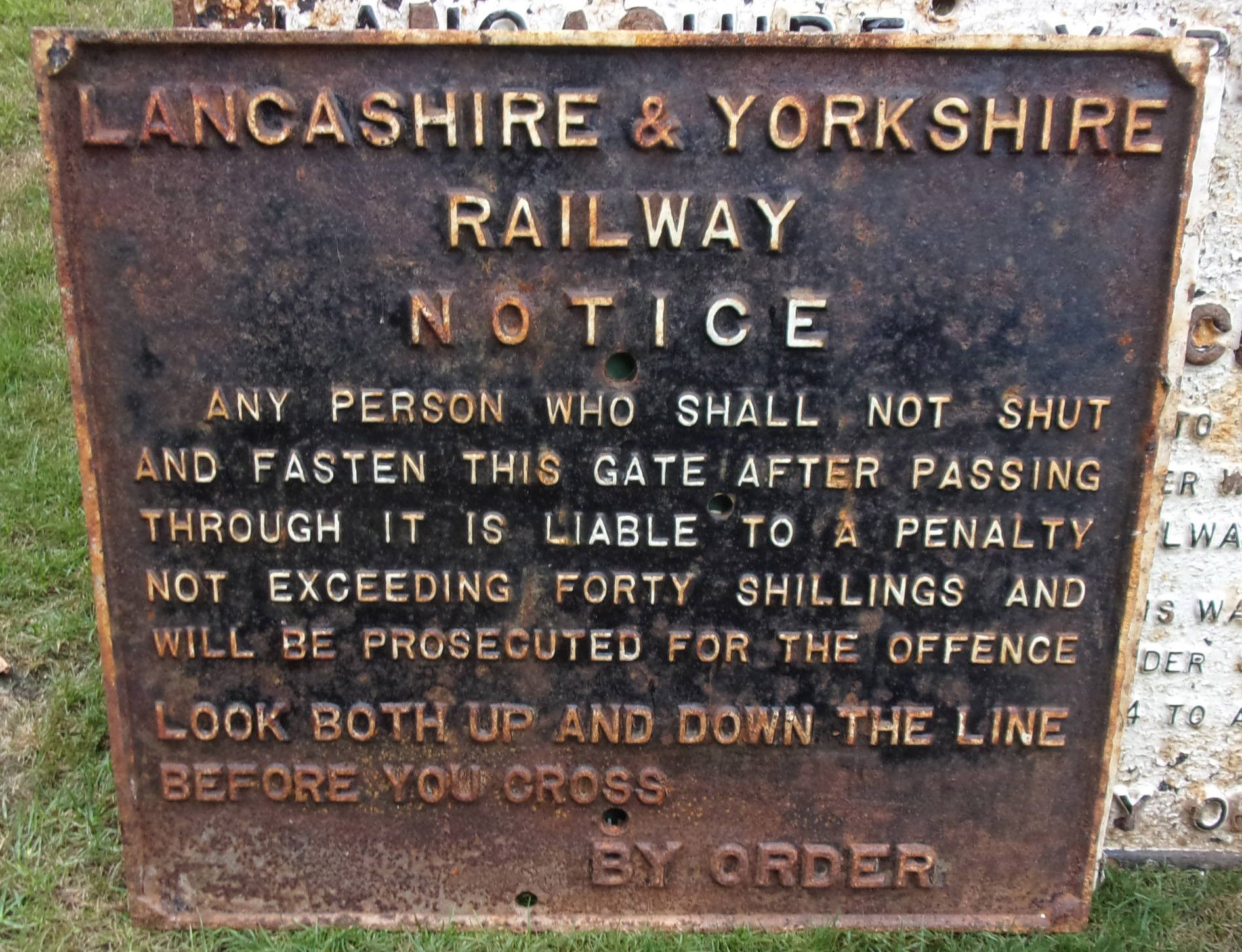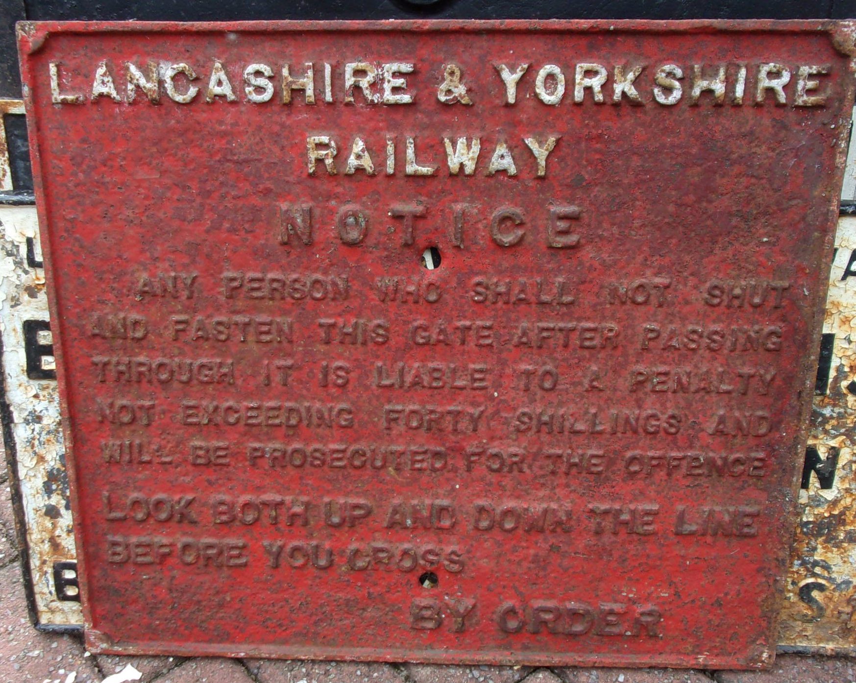 Cast iron sign “Lancashire & Yorkshire Railway Notice” ref to Gate Close etc. Ex Lineside with post mark to back, sound condition. 23″ x 21″. | £40.00 |