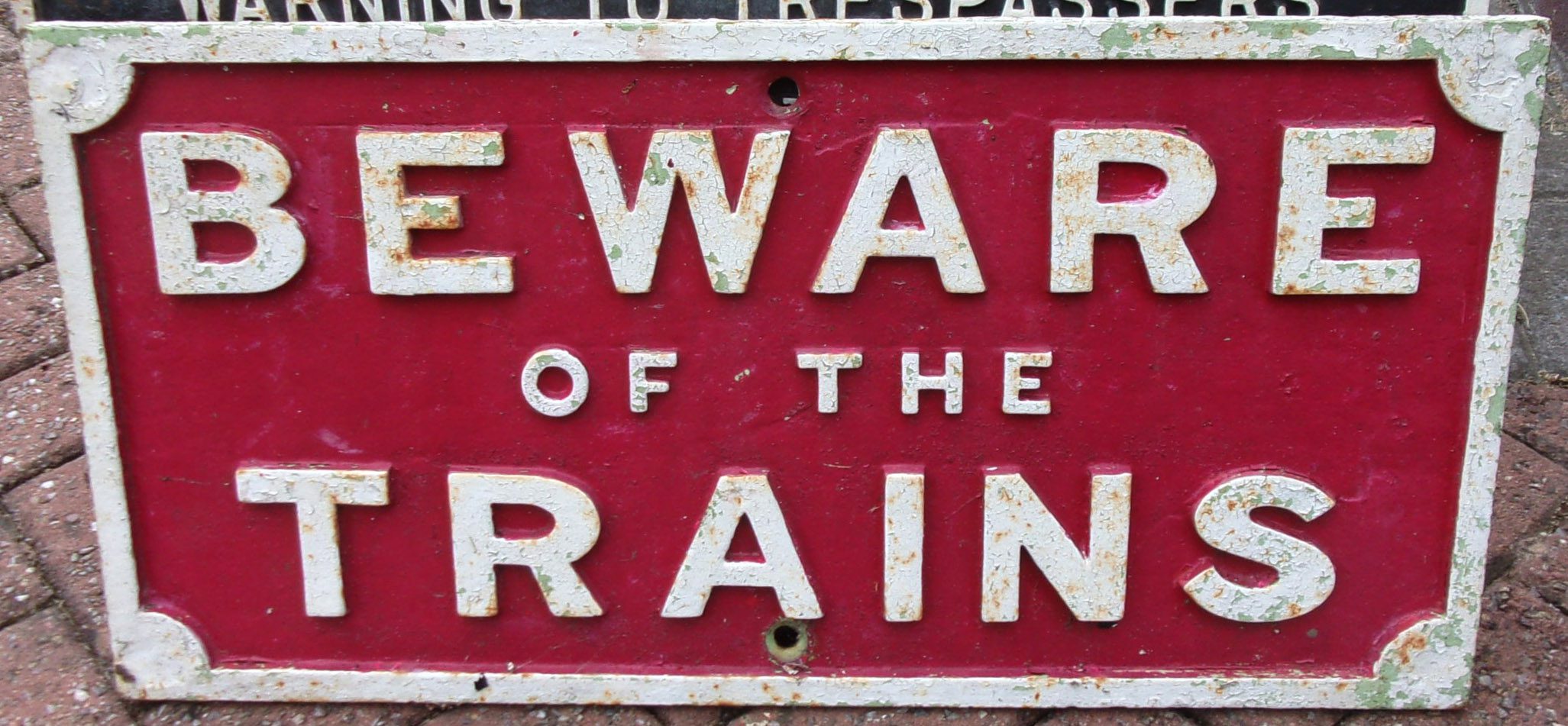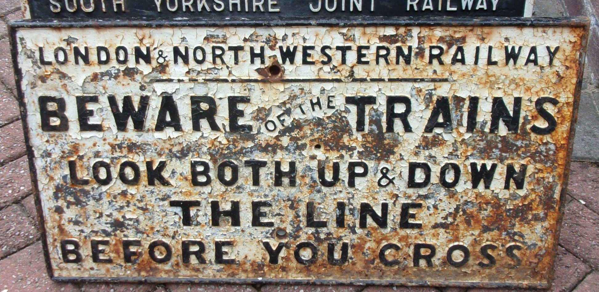 Cast iron sign untitled L&Y RY “Beware of the Trains”, repainted face & back. 27″ x 13 1/2″. Sound condition. | £125.00 |