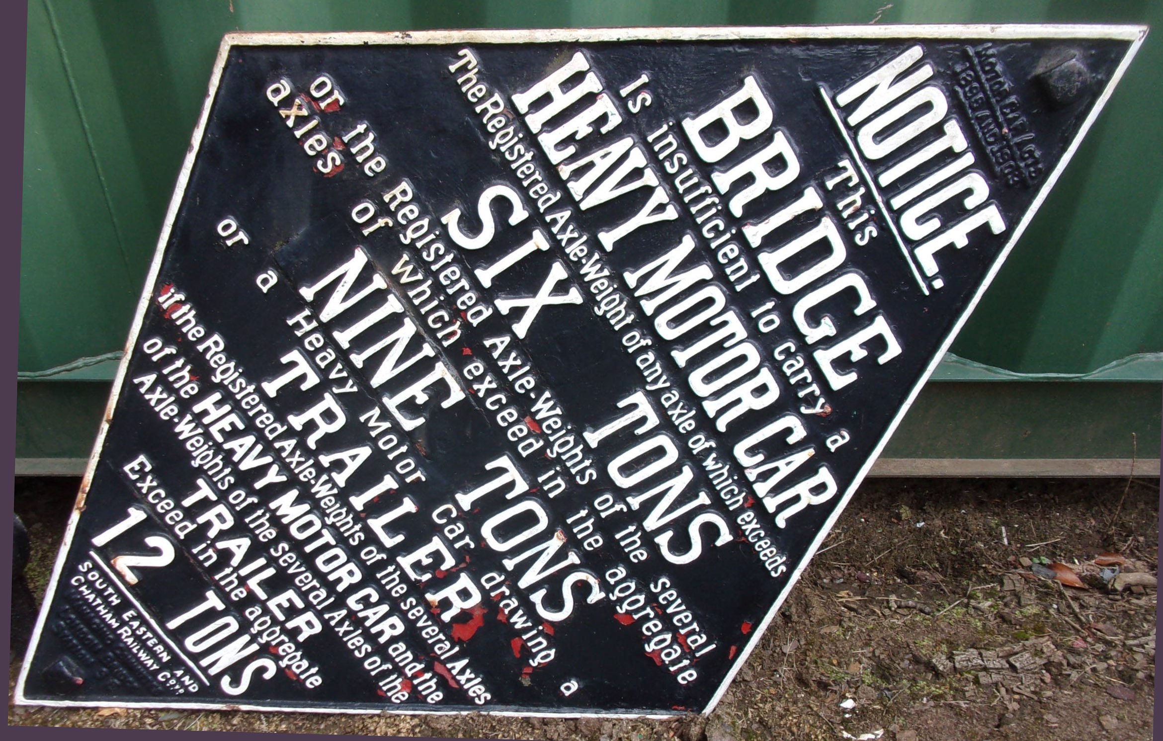 Cast iron Bridge Diamond “South Eastern & Chatham Railway”, all weight plates intact. Repainted face only. 50″ x 31″ sound condition. | £60.00 |