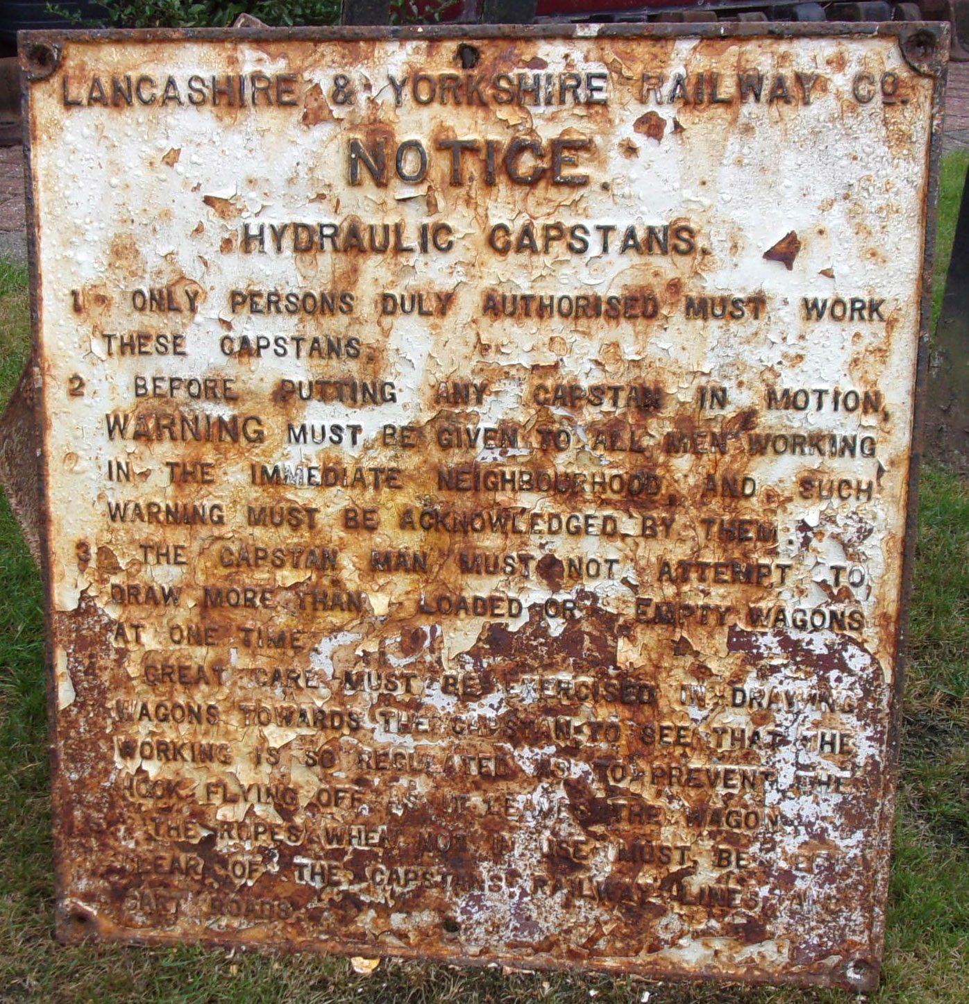 Cast iron sign “Lancashire & Yorkshire Railway Notice” ref to Hydraulic Capstans Regulations. Ex lineside sound condition. 24″ x 23″. | £60.00 |
