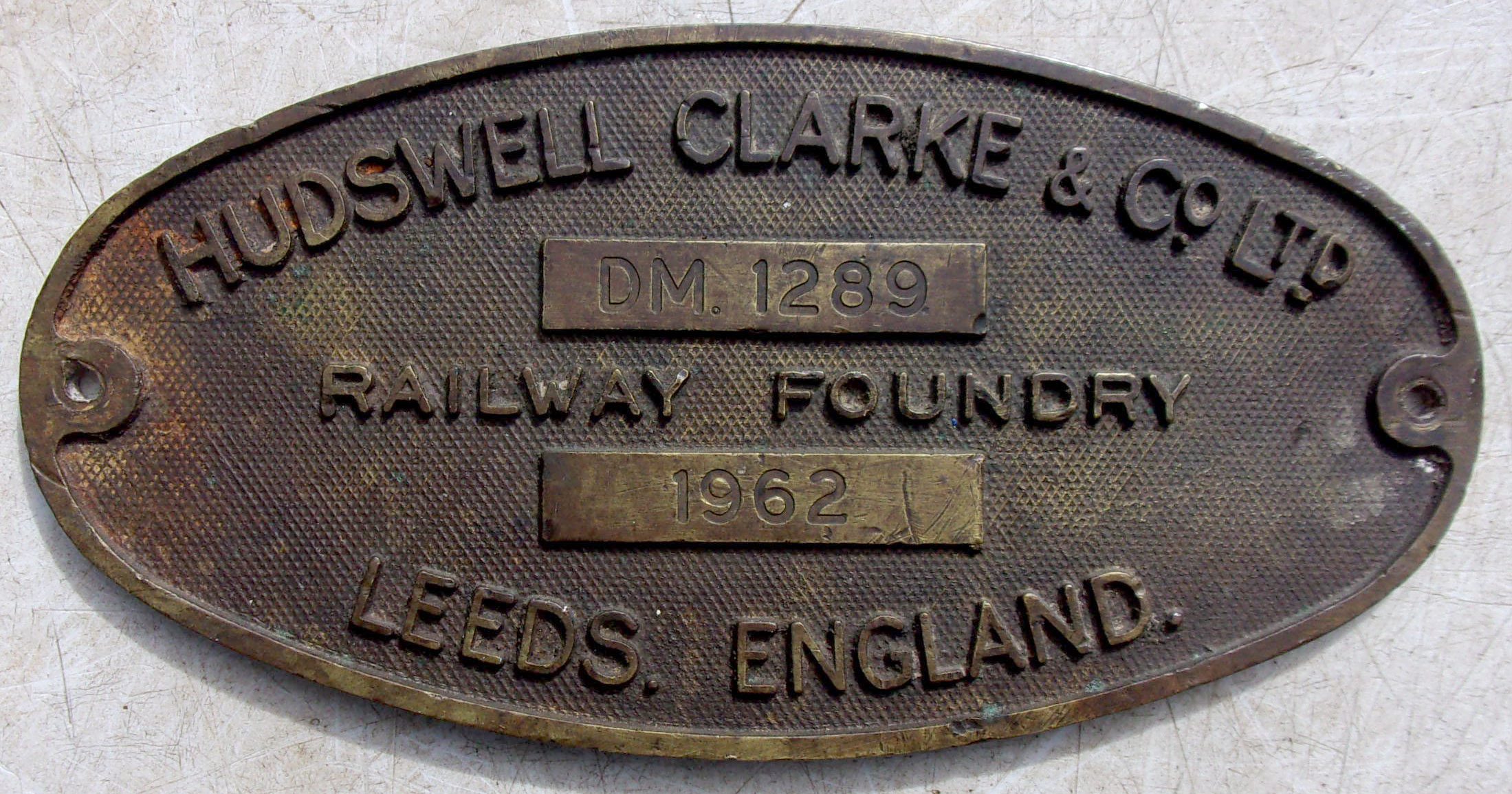 Locomotive Worksplate “Hudswell Clarke & Co Ltd Railway Foundry Leeds England DM1289 1962″, as carried by Diesel Mechanical 0-6-0 2ft 6″ gauge, supplied to Agecroft Colliery, Manchester. Embossed cast brass. 8 1/4″ x 4 1/8”. Ex loco condition. | £110.00 |