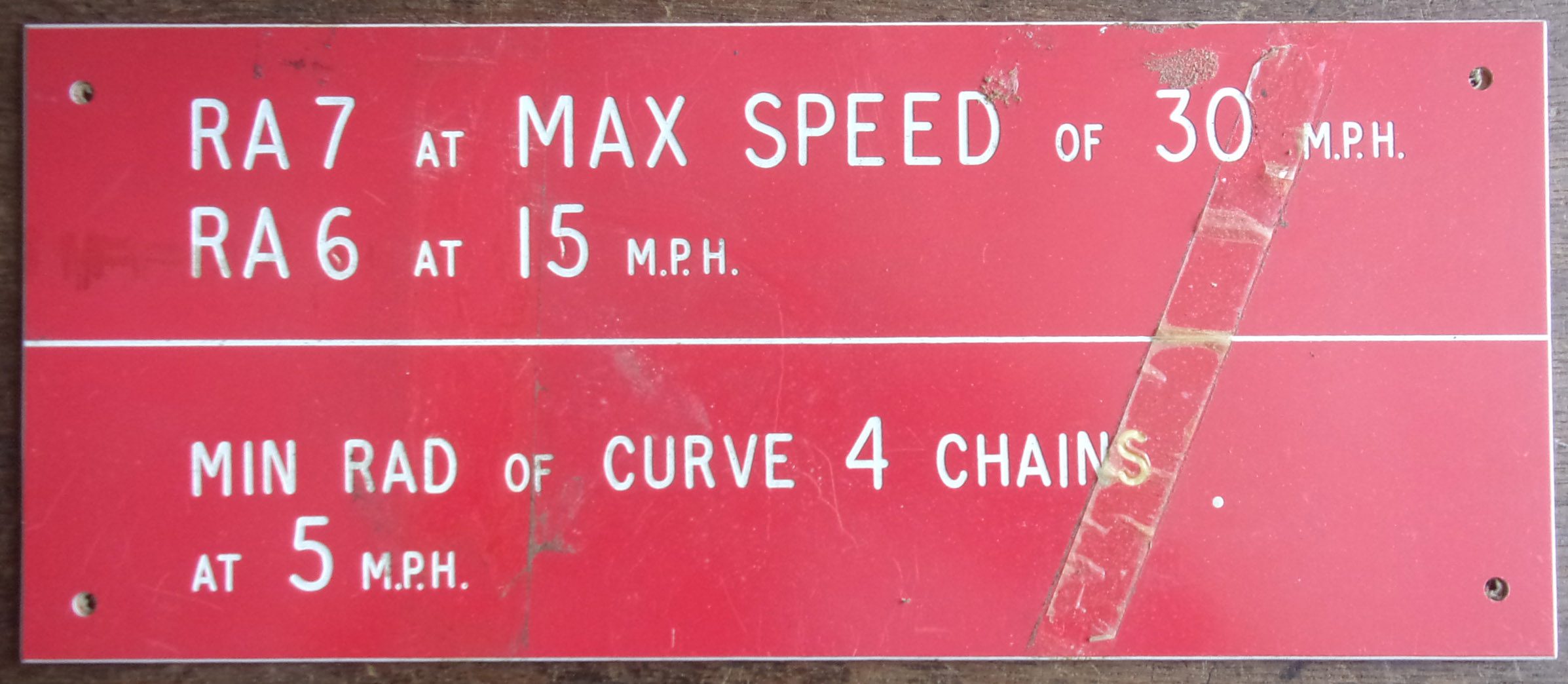 Traffolite sign “RA 7 at max speed of 30mph RA at 15mph min rad of curve 4 chains at 5mph”. 12″ x 5″. | £10.00 |