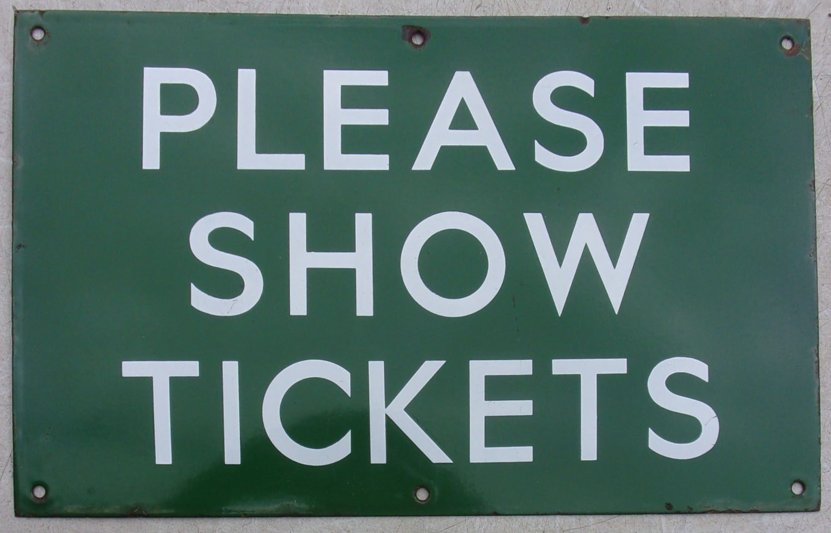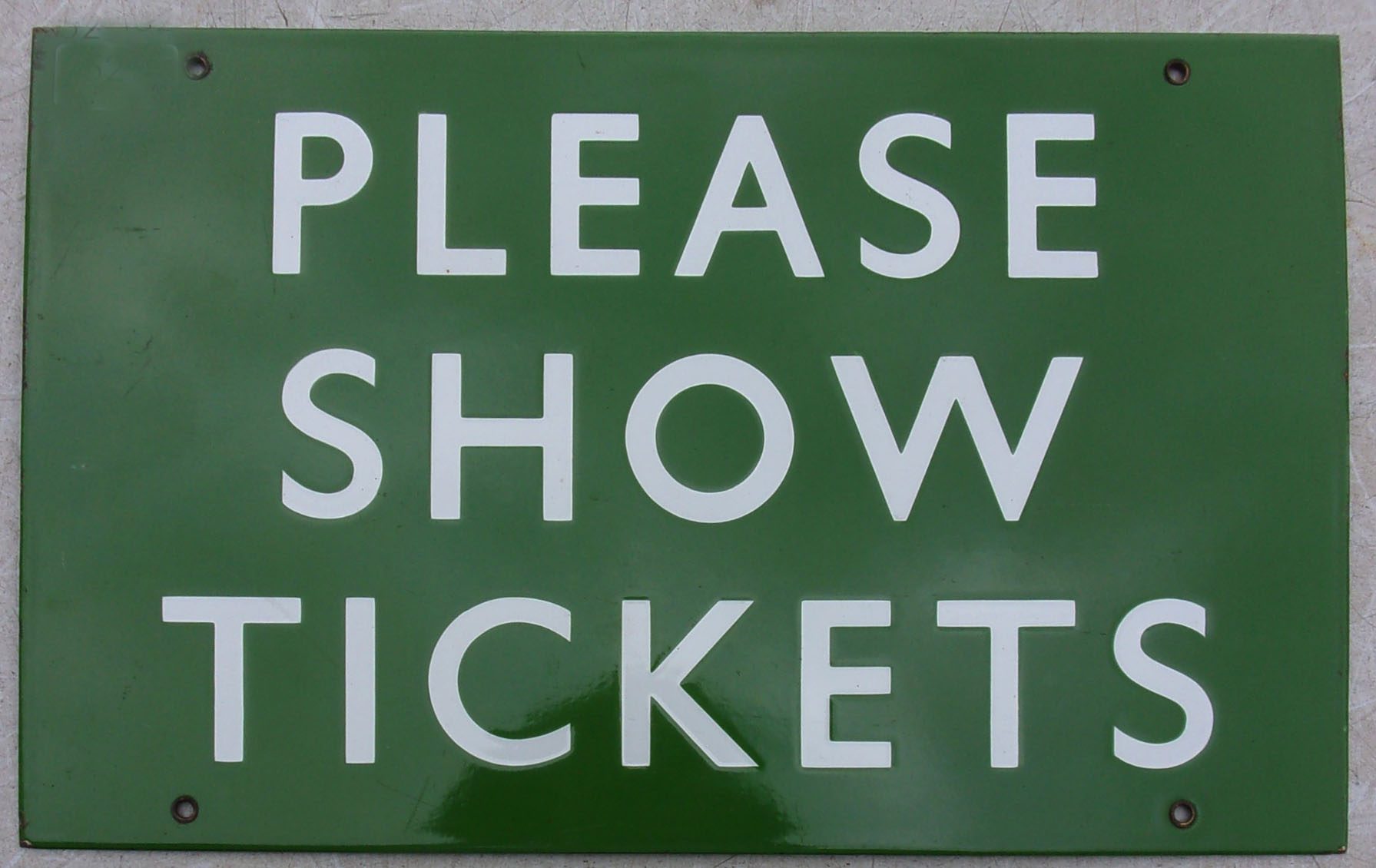 Enamel Sign BR(S) “Please Show Tickets”. Super condition, super colour & shine. 16″ x 10″. Complete with brass inserts to fixing holes. | £80.00 |