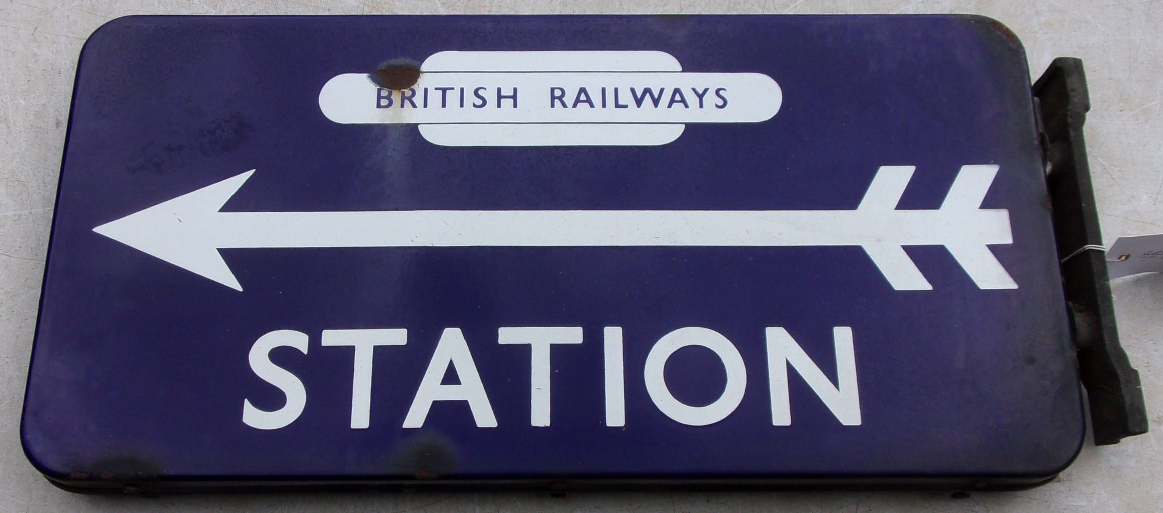 Enamel BR{E} double sided station direction sign “British Railways Station” with left facing arrow, chip to totem logo and to bottom edge. Very good colour & shine. 21″ x 10 1/2″. Complete with wall mounting bracket. | £250.00 |